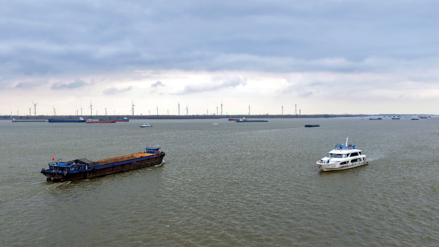 3月30日,航拍位于江西湖口县的长江与鄱阳湖交汇处,船只往返江面。(图片来源:中新社)
