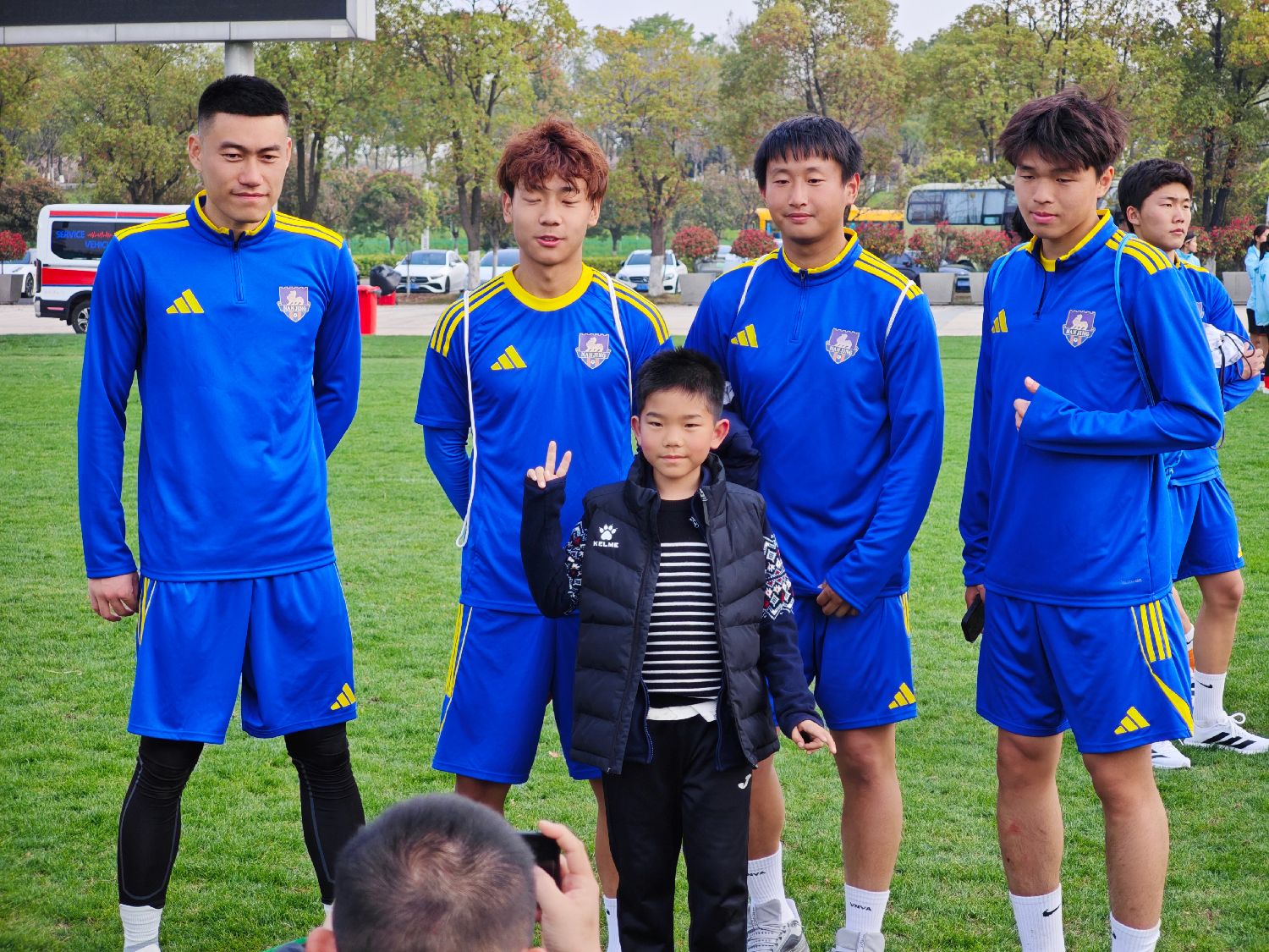 4月1日,孩子们踏入绿茵场,观摩“苏超”南京队训练,并和队员们互动。(图片来源:中新社)