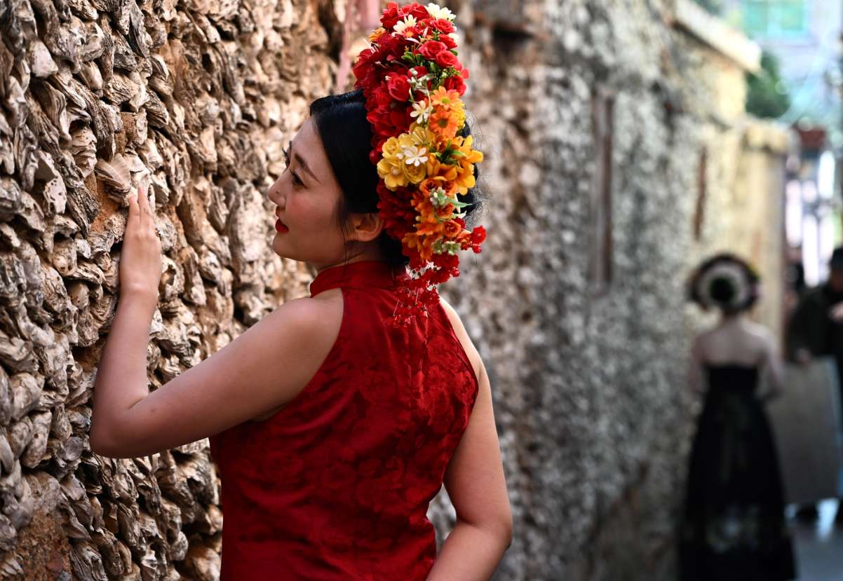 图为3月17日,体验“簪花围”的游客在福建泉州蟳埔村的蚵壳厝旁拍照。