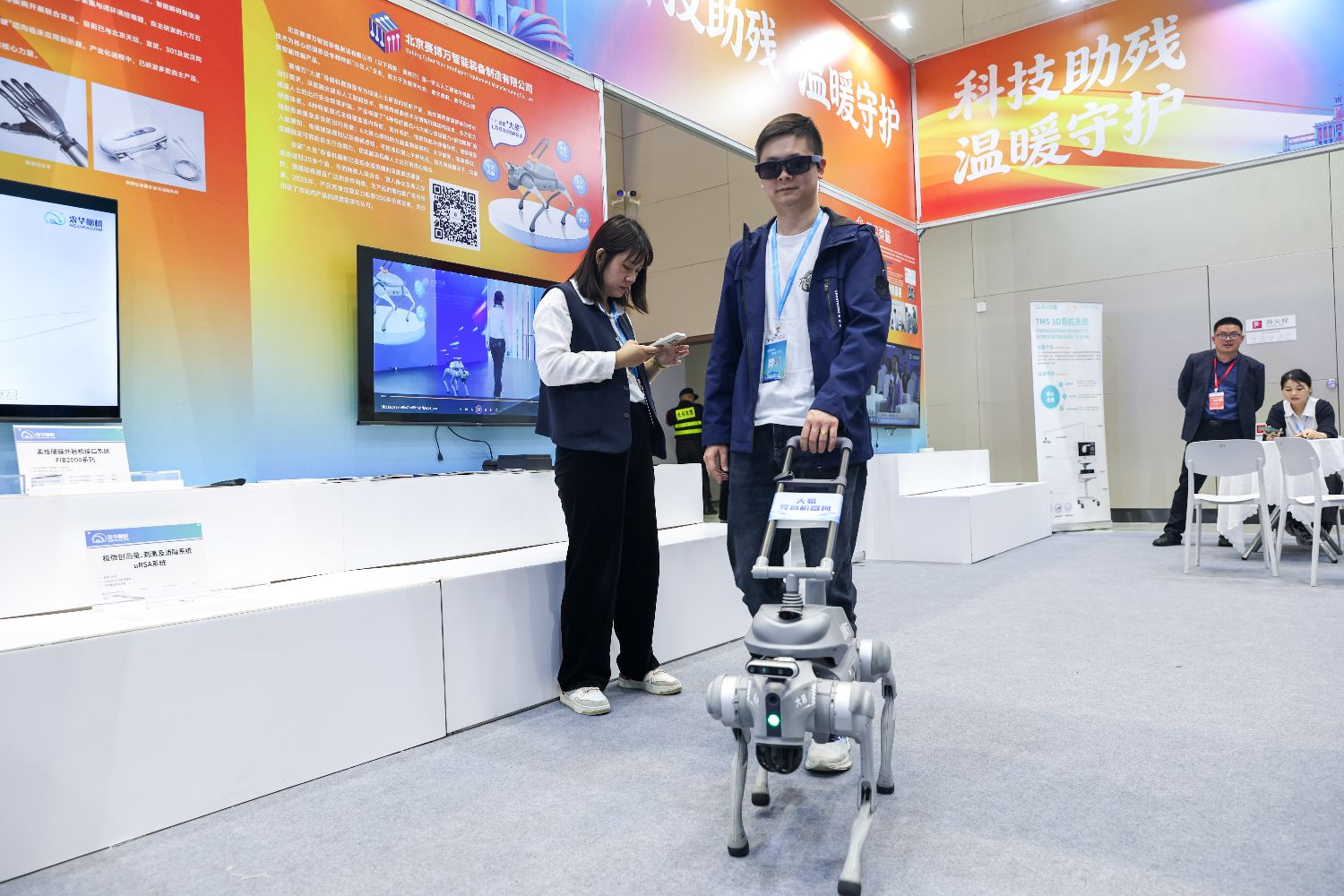 中新社8日报道,具备检测、紧急呼叫、娱乐等功能的人工智能(AI)健康陪护机器人,可为视障人士提供引路、对话交流、安防监控等服务的导盲机器狗……现场,一批AI技术与医疗、康养、助残、康复等应用深度融合的产品亮相。其中,脑机接口、智能机器人等前沿成果备受关注。