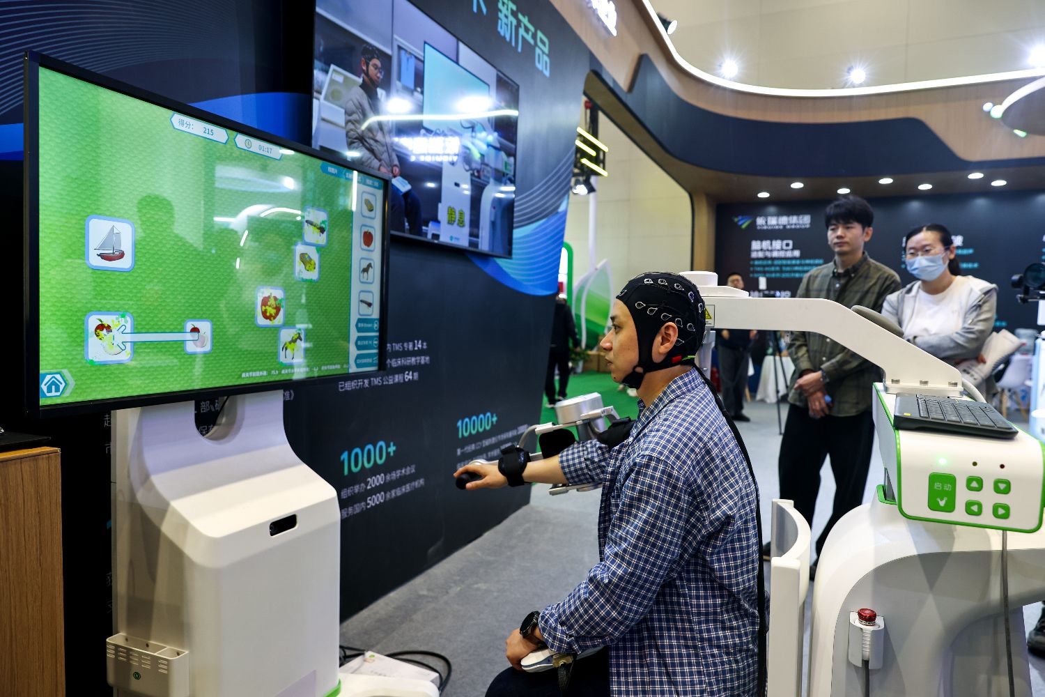 头戴无创脑电帽,想象要抓取的图片,系统解码意图后,驱动机械臂辅助完成图片抓取……在依瑞德集团展区,现场展示的“光电双模态”脑机接口康复系统引来关注。该集团董事长蔡胜安介绍,目前该系统处于临床验证阶段,已可实现“意念控制”下的上肢、下肢及吞咽康复训练。
