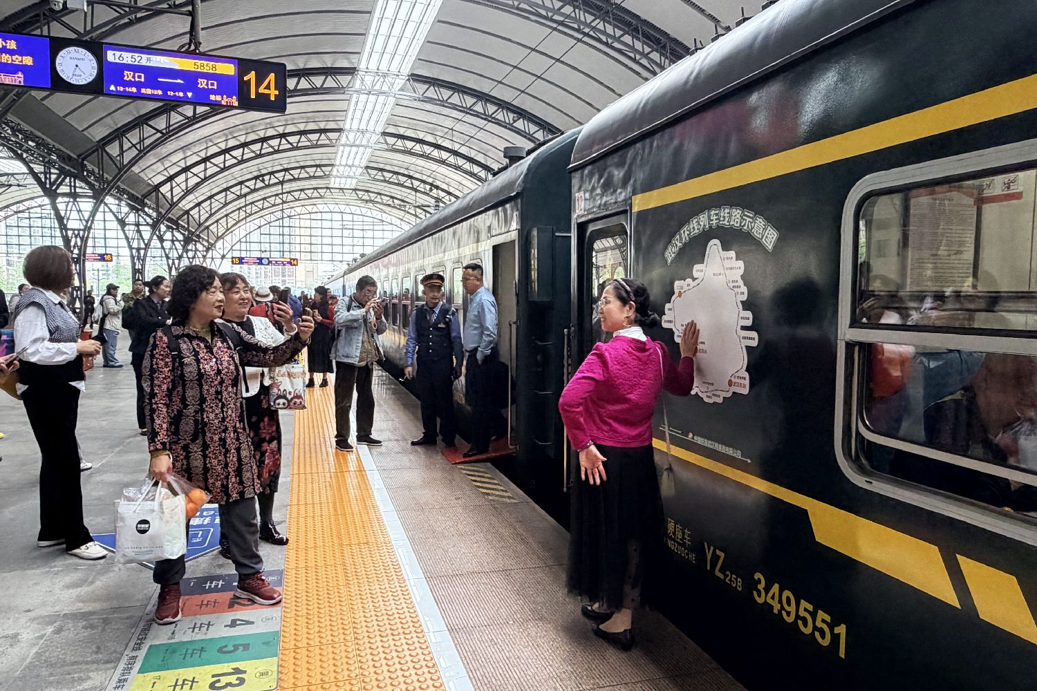 当日16时52分,5858次列车缓缓从汉口站驶出。墨绿色车身、蓝色座椅套、可开启车窗等元素,还原了传统绿皮火车风貌。