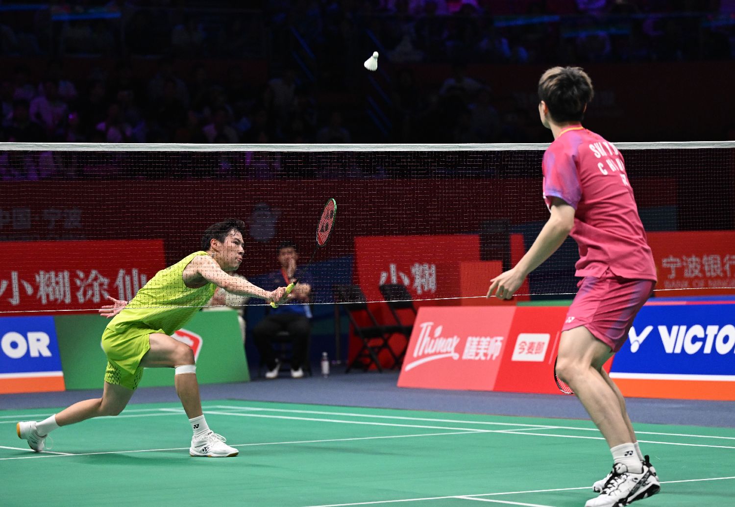 4月9日,2026亚洲羽毛球锦标赛在浙江宁波举行,中国香港选手李卓耀(左)0比2不敌中国选手石宇奇(右)。(图片来源:中新社)