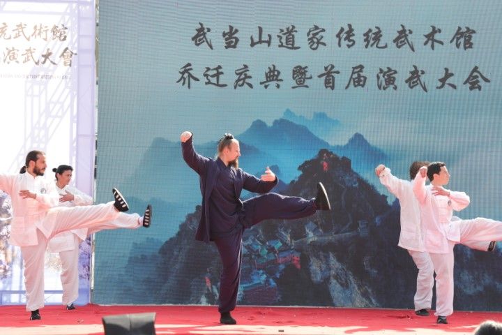 2018年,武当山道家传统武术馆乔迁庆典暨首届演武大会上,杰克上台表演。(受访者供图)