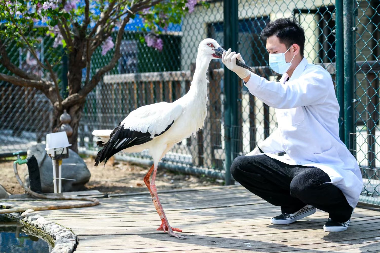 4月12日,天津市宝坻区阳光野生动物收容救护中心工作人员为安装了“机械假肢”的东方白鹳做检查。(图片来源:中新社)