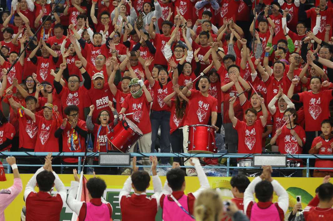 4月11日晚,2026年江苏省城市足球联赛(苏超)揭幕战在常州奥体中心体育场举行,最终,常州队(红衣)3比0战胜南通队(蓝衣)。图为常州队球迷庆祝常州队获胜。