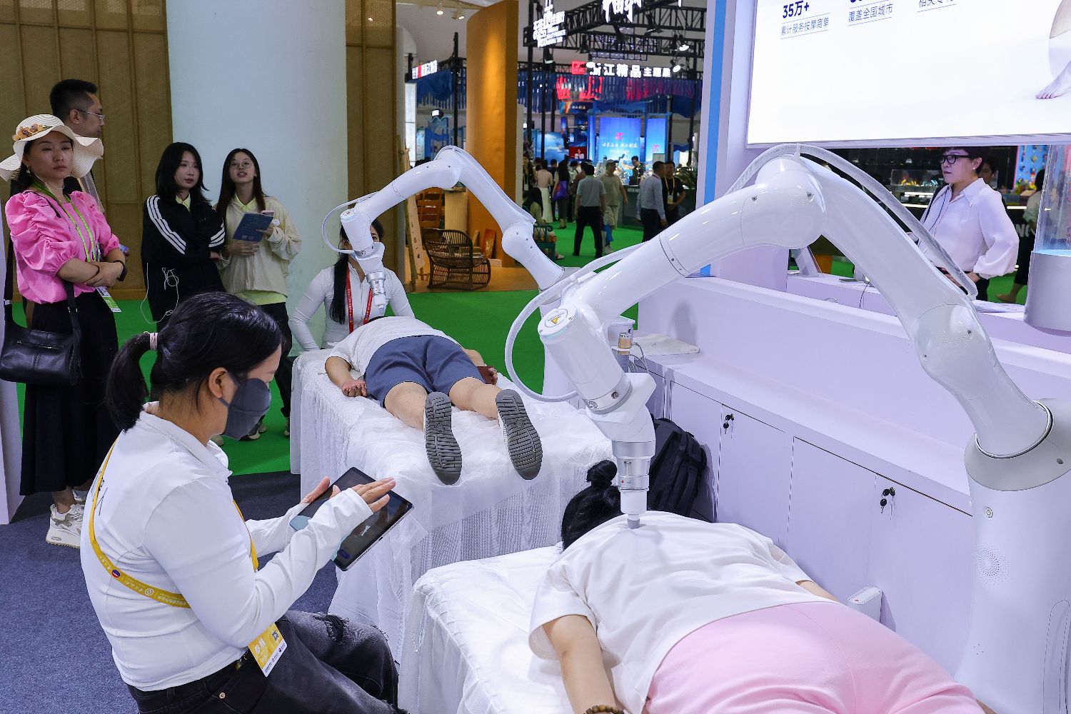 另一品牌展馆内,几名观众正闭目体验智能按摩椅。该产品引入非接触式AI压力监测技术,仅需几十秒面部识别,即可获取心率、呼吸频率、压力指数等关键数据,并自动匹配最适宜的按摩程序。
