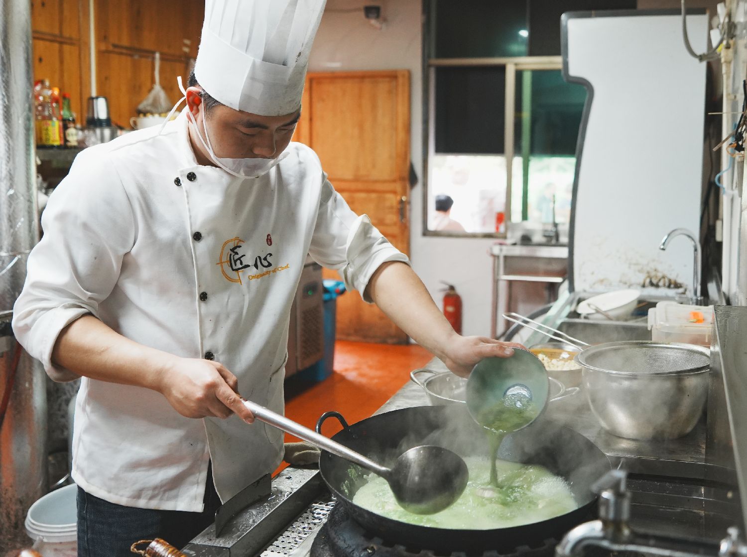 【本报讯】春日,地处贵州省铜仁市江口县梵净山脚下的一家食府后厨里,豆腐与鲟鱼头在大锅里沸腾。主厨瞅准火候,将一碗翠绿的抹茶汁高高举起,在鱼头将熟未熟时扬手淋下,茶香渗入肉里;第二碗抹茶汁则在关火前倏然点入,整锅汤顿时浸染一层柔和绿意。