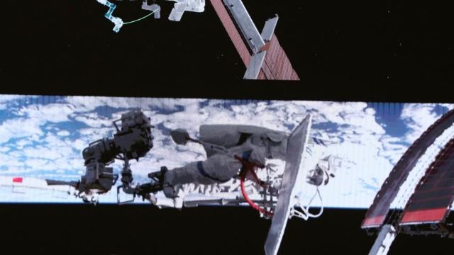 4月16,神舟二十一号乘组航天员武飞在舱外工作。(图片来源:新华社)