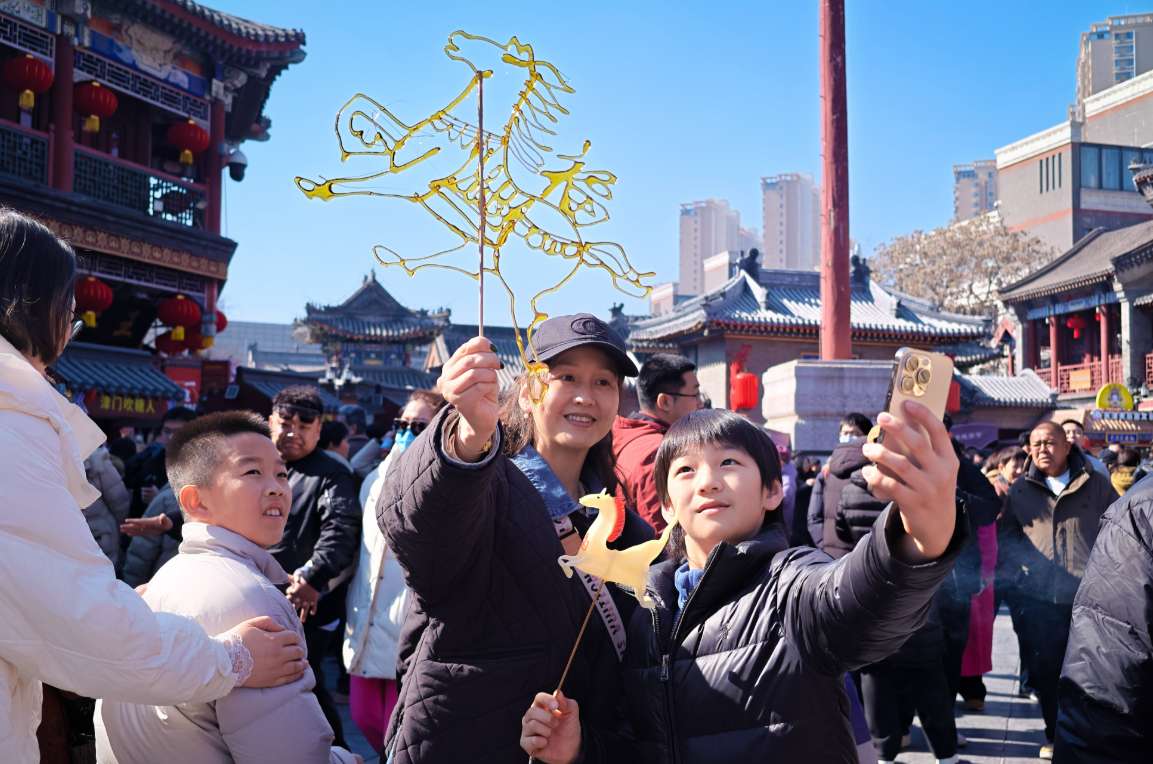 2026年2月17日,农历大年初一,八方游客在天津古文化街体验津味儿民俗迎新春。图为游客手持“马上有福”糖画自拍。(图片来源:中新社)