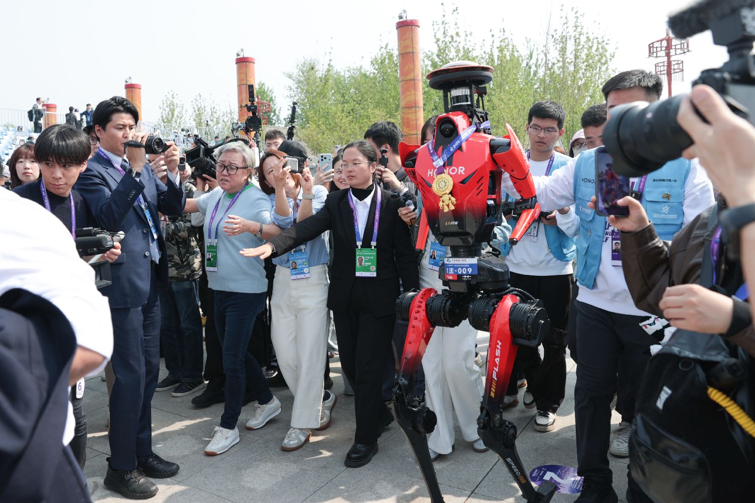 今年的赛道堪称“极限训练场”,融合了22个弯道、陡坡及复杂的户外光线变化。来自荣耀“齐天大圣”战队的机器人“闪电”凭借惊人的步频和动态平衡能力,以50分26秒的净成绩夺冠。这一成绩,比乌干达名将基普利莫今年3月刚刚创造的人类男子半马世界纪录(57分20秒),快了将近7分钟。