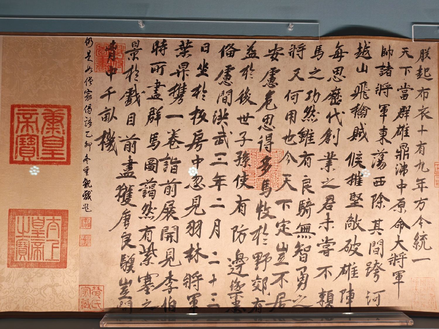 该画作另一大看点是卷尾明代朱元璋洋洋洒洒一大篇题跋,“朕起布衣,十有九年,方今统一……”马顺平表示,看朱元璋的字,可能感觉写得不好,甚至还能找到错别字,但从整体看,题跋仍是气势磅礴。