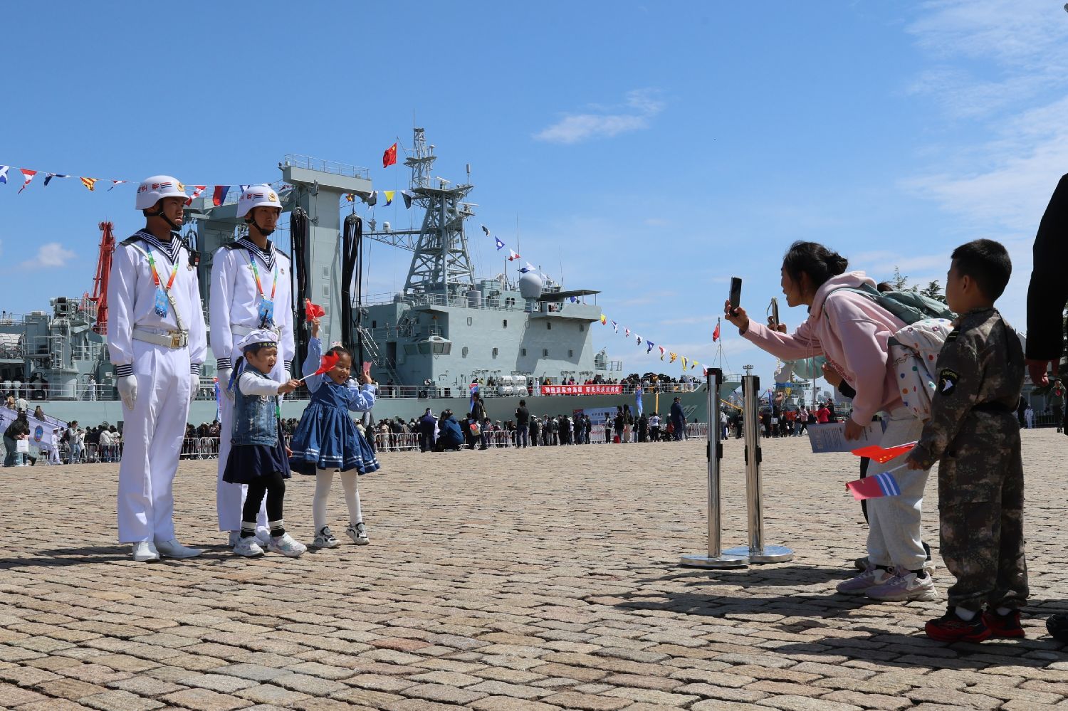 4月22日,北部战区海军舰艇开放活动首日,家长在码头为小朋友拍照。(图片来源:中新社)