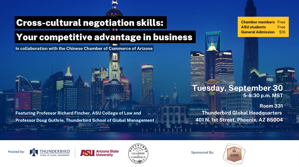 亚利桑那中华商会诚挚邀请您参加由中华商会与雷鸟商学院(Thunderbird School of Global Management)联合主办的“跨文化谈判技巧研讨会(Cross-Cultural Negotiation Seminar)”。