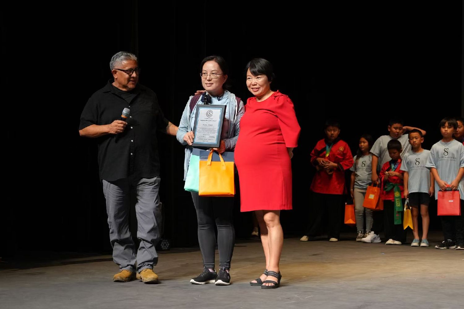 接下来的义工颁奖环节,来自chanler市副市长Christine Ellis,The Metropolitan Youth Symphony执行主任Karalee K.Hagen、UCAAZ主席徐国富、The8Foundation特邀顾问胡昌铭老师、《亚省时报》社长甄凯婴、亚利桑那中华商会会长Lisa Liu Ritchie、The8Foundation创始人Jose与Yan Gonzales夫妇、亚利桑那少林寺文化中心释延倾师父、小蜻蜓艺术学校校长吴小婷,以及Phoenix Guzheng Ensemble与Phoenix Peony Ensemble的Sabina老师为小义工颁奖。