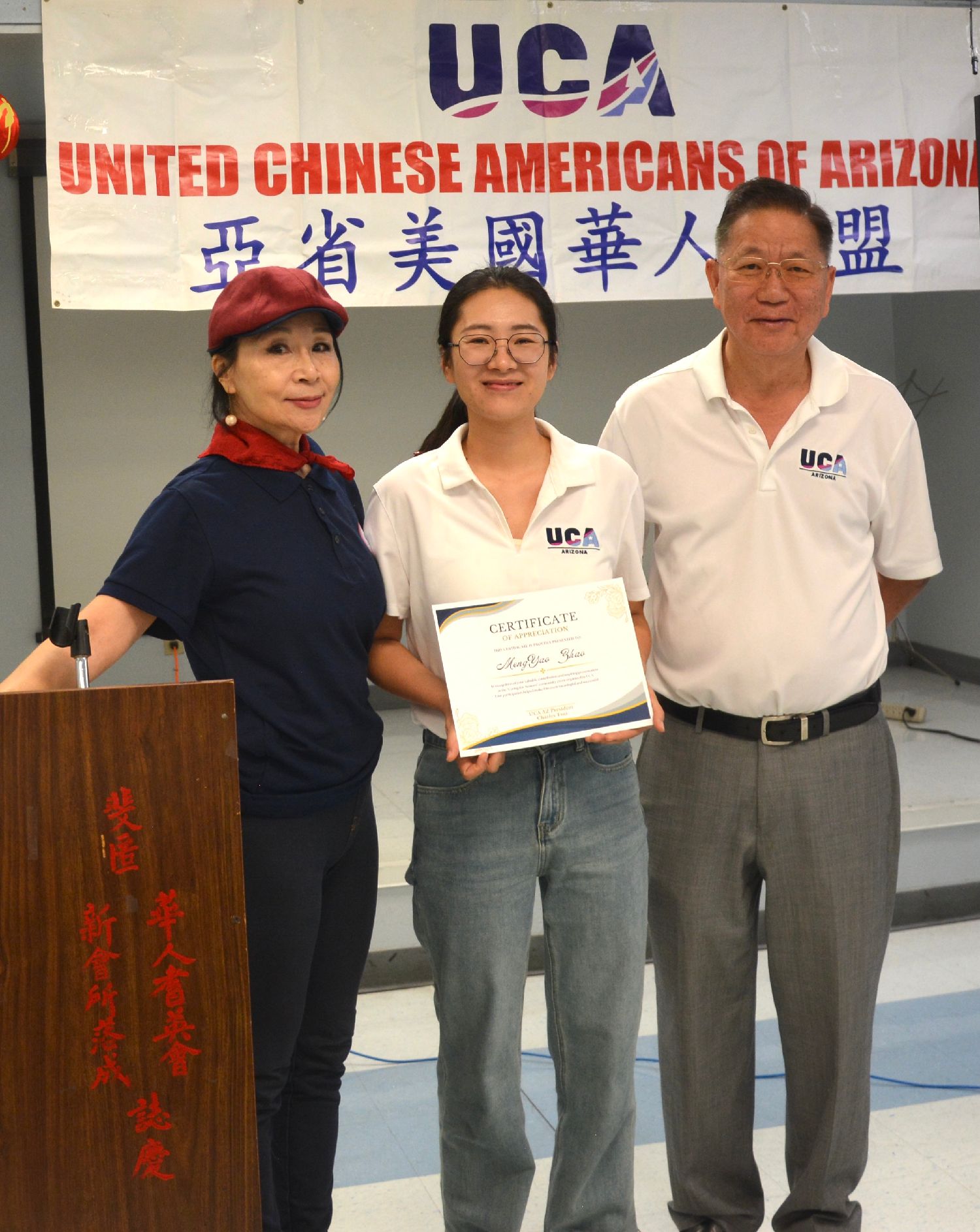 凤凰城华人耆英会主席最后致感谢辞,感谢亚省美国华人联盟给大家带来精彩讲座,为长者朋友养老养生带来新咨询。徐国富主席代表UCA AZ向两位主讲嘉宾赠送嘉奖状,并送上由张华芳女士送出的礼券,到场所有耆英中心会员及嘉宾更获得六福酒家送出的礼券一份。