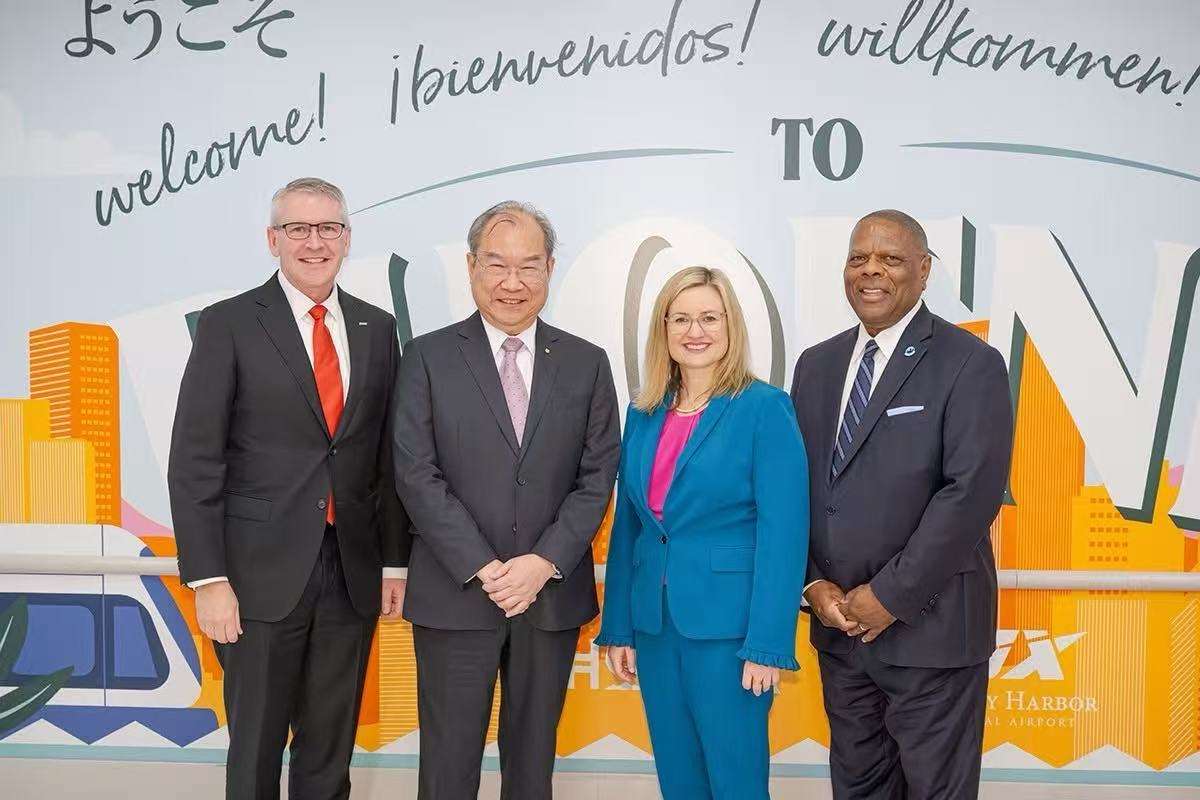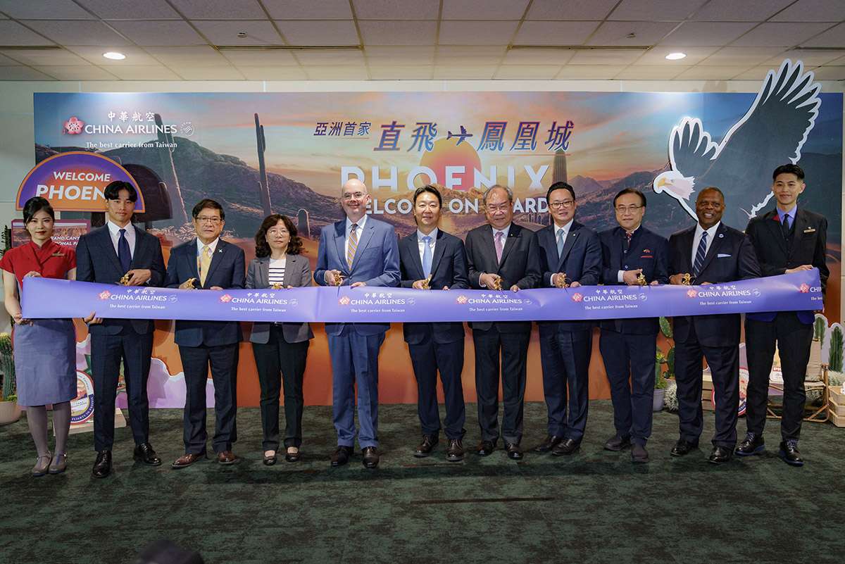 华航在天港机场举行庆祝活动,董事长高星潢、交通部长陈世凯、美国在台协会台北办事处处长谷立言,凤凰城市长凯特·加列戈(Kate Gallego),凤凰城第6选区市议员凯文·罗宾森(Kevin Robinson),及台侨代表齐聚一堂。