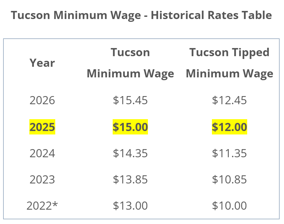 2026年1月1日中,图森最低工资调整为每小时15.45美元,小费员工的最低工资每小时12.45美元。