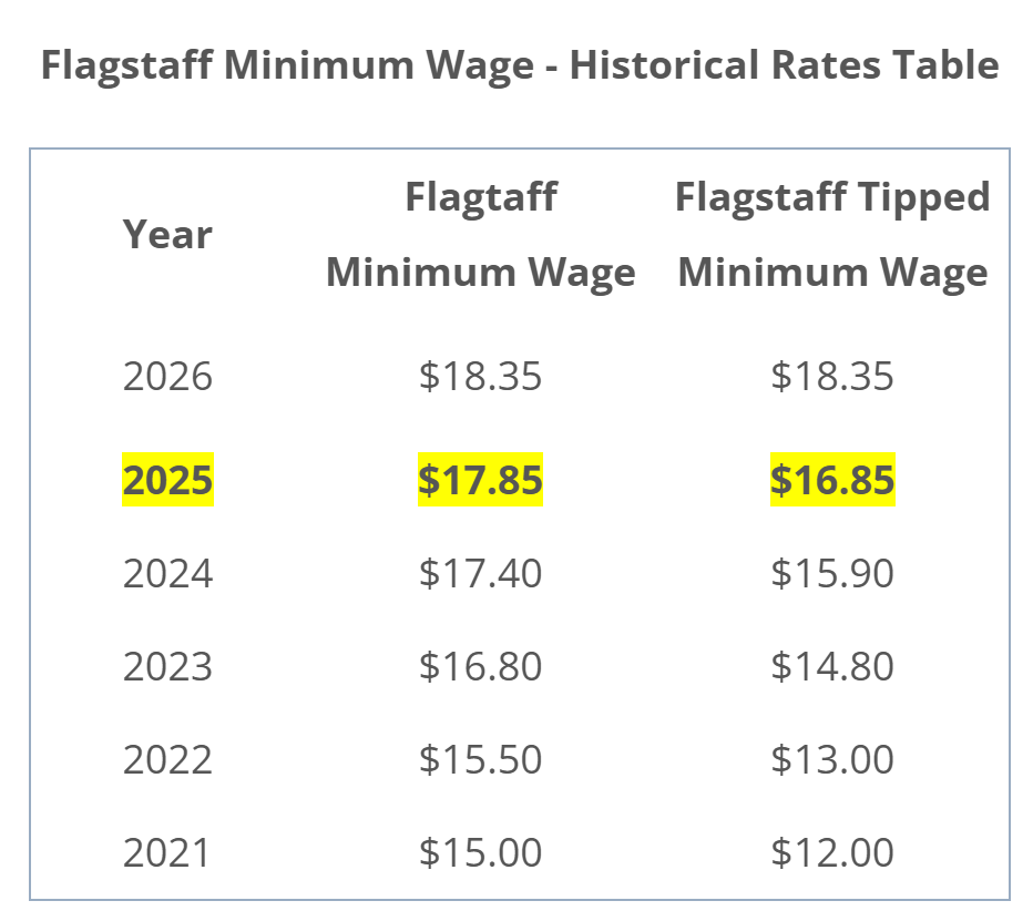 从2026年1月1日起,旗杆市最低工资将从16.85美元,调整为每小时18.35美元,包括赚钱小费的员工在内。