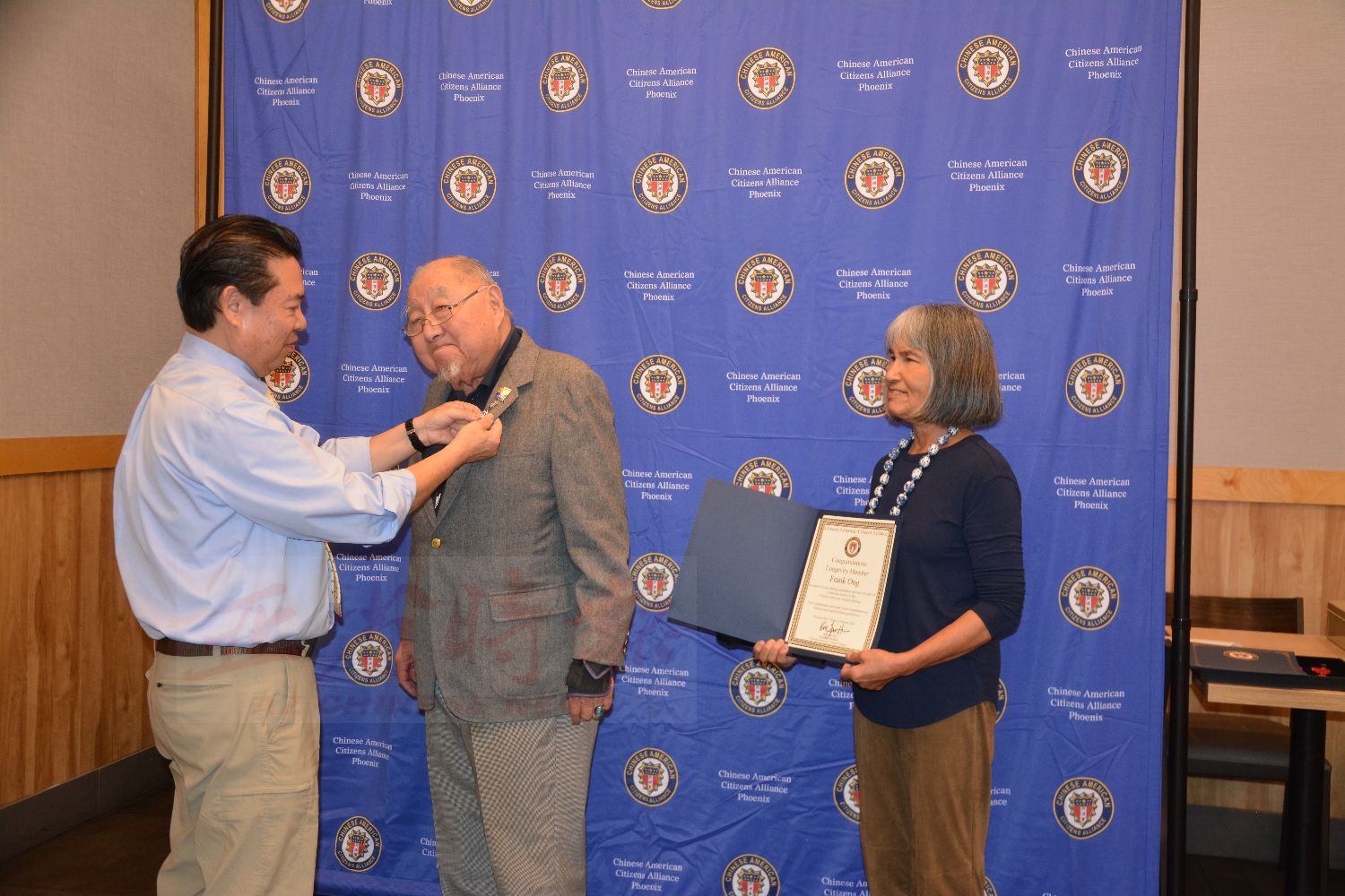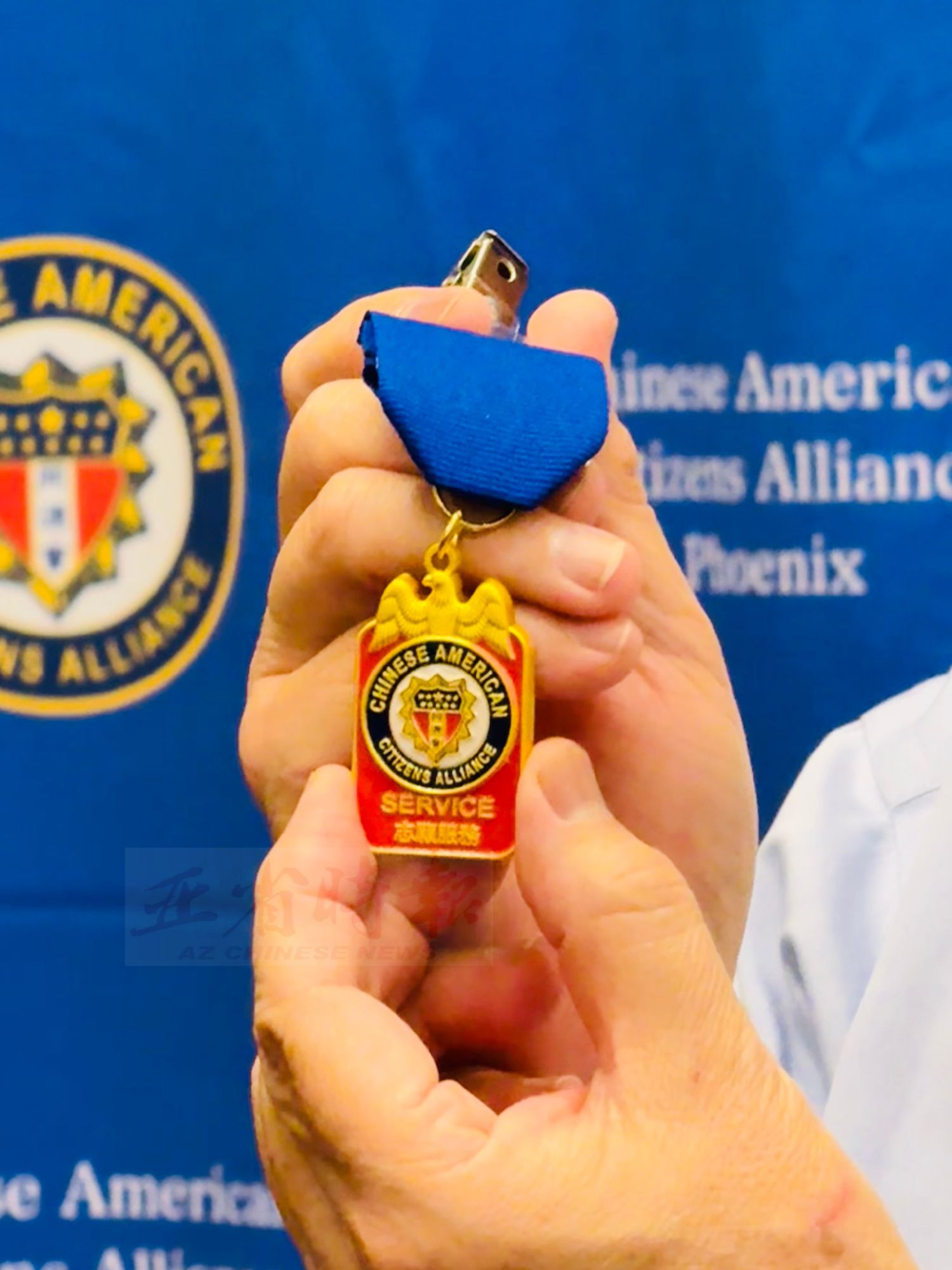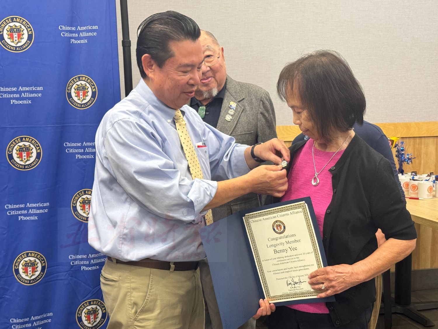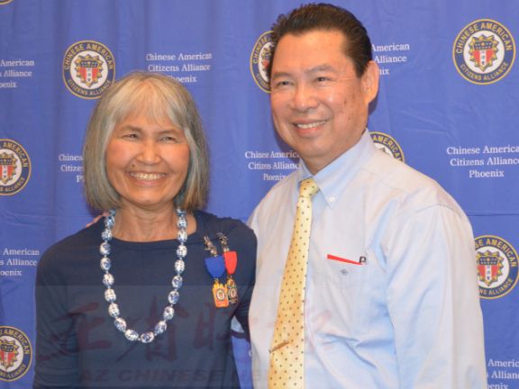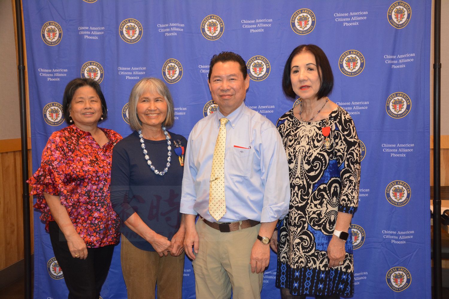 许会长还向凤凰城分会会长 Donna Woo-Quintana、会员Eve Collins及Eva Li 颁发「服务勋章」,表扬她们日前赴旧金山出席美洲同源会全国大会,凤凰城同源会分会参与全国性会务交流与倡议。