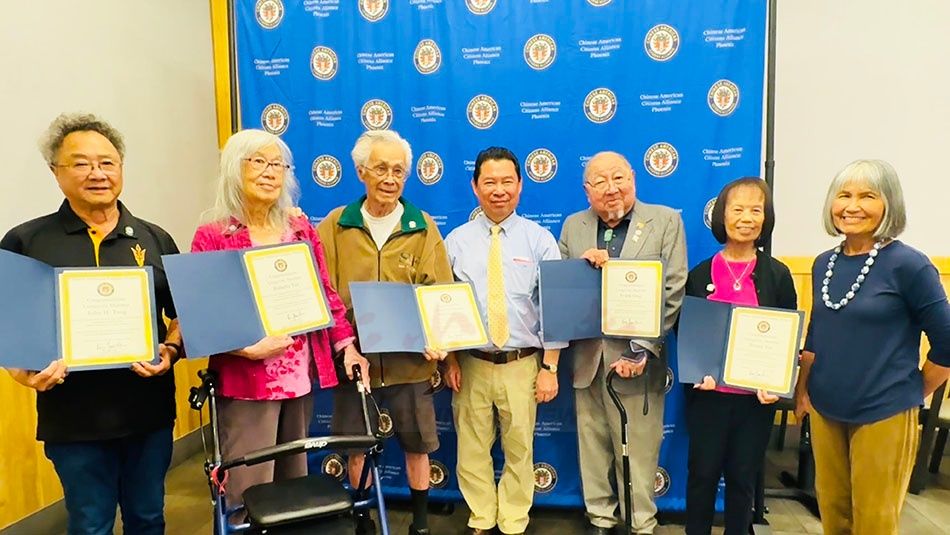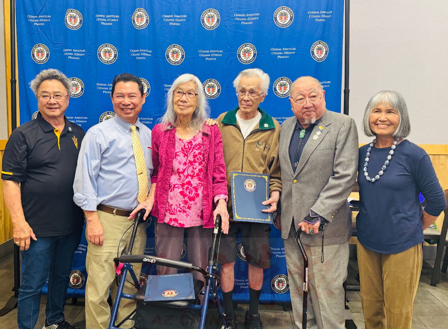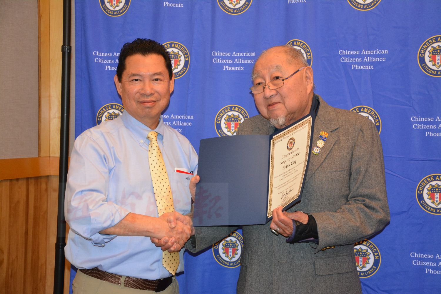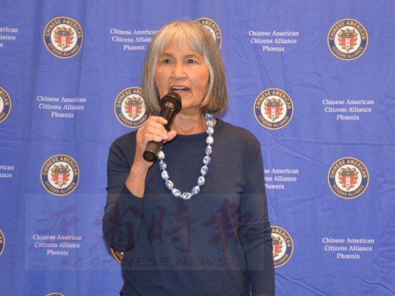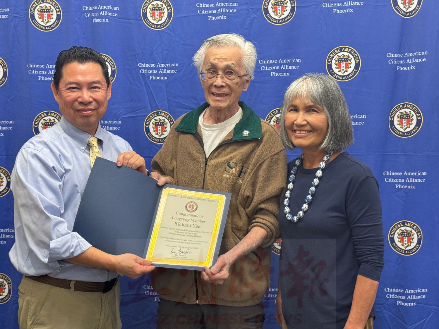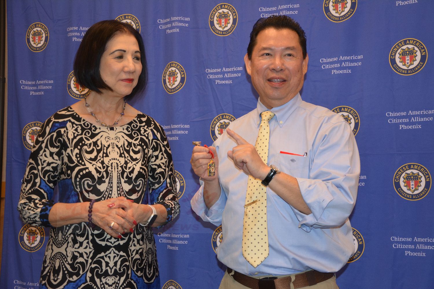 许会长还向凤凰城分会会长 Donna Woo-Quintana、会员Eve Collins及Eva Li 颁发「服务勋章」,表扬她们日前赴旧金山出席美洲同源会全国大会,凤凰城同源会分会参与全国性会务交流与倡议。