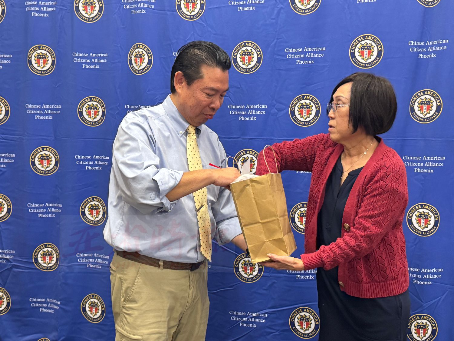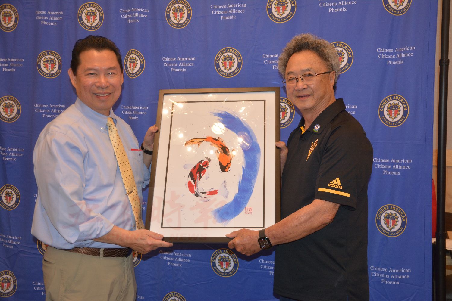 为感谢许会长远道而来,会员 John Tang特别致赠其亲自创作的锦鲤画作作为纪念;会员Ansley Meng亦送上象征社区精神的 Arcosanti青铜钟,表达凤凰城分会的诚挚谢意。