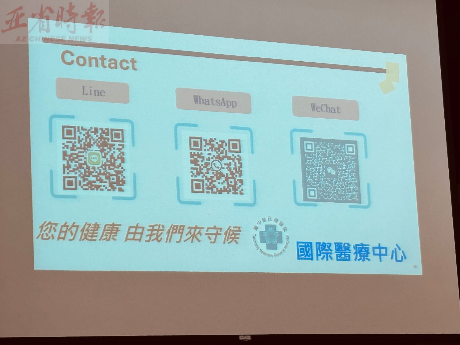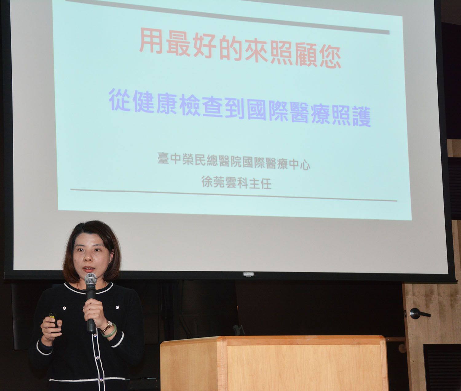 此外,國際醫療中心科主任徐莞雲以《從健康檢查到國際醫療招呼》為題,說明台中榮總如何為國際病患提供從健檢、專科診療到跨國協調的一站式服務,協助海外民眾無縫銜接台灣優質醫療資源。她表示,只要客人在定好赴台機票後跟她聯繫,她立即安排最短時間內得到治療。大家也不用擔心費用過高,沒有台灣健保的賓客費用只是有健保的1.6倍。