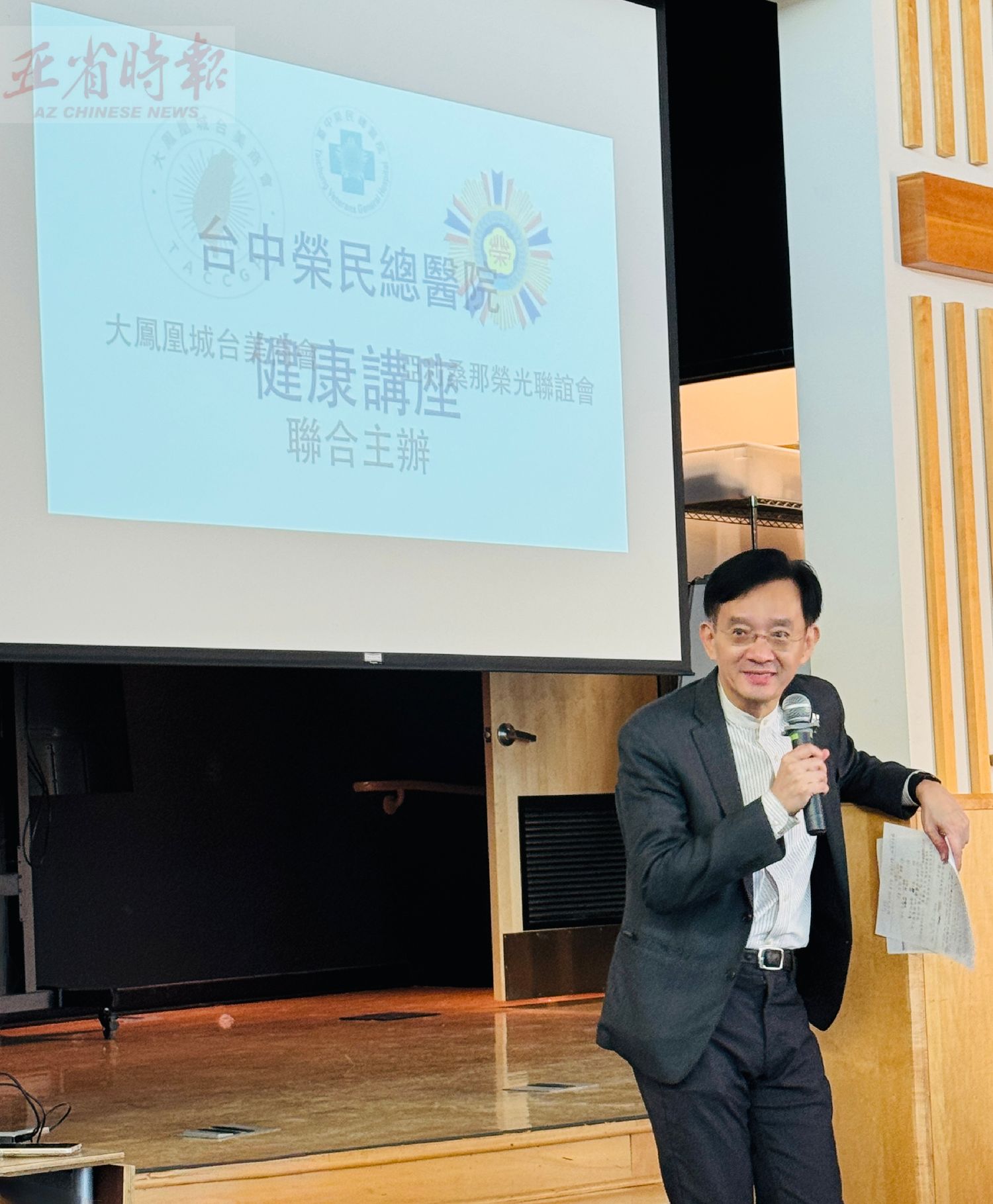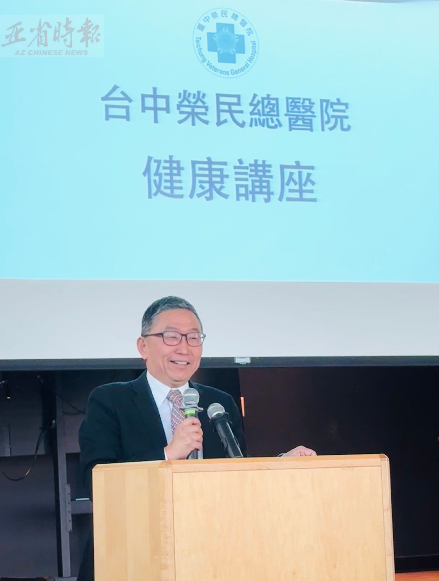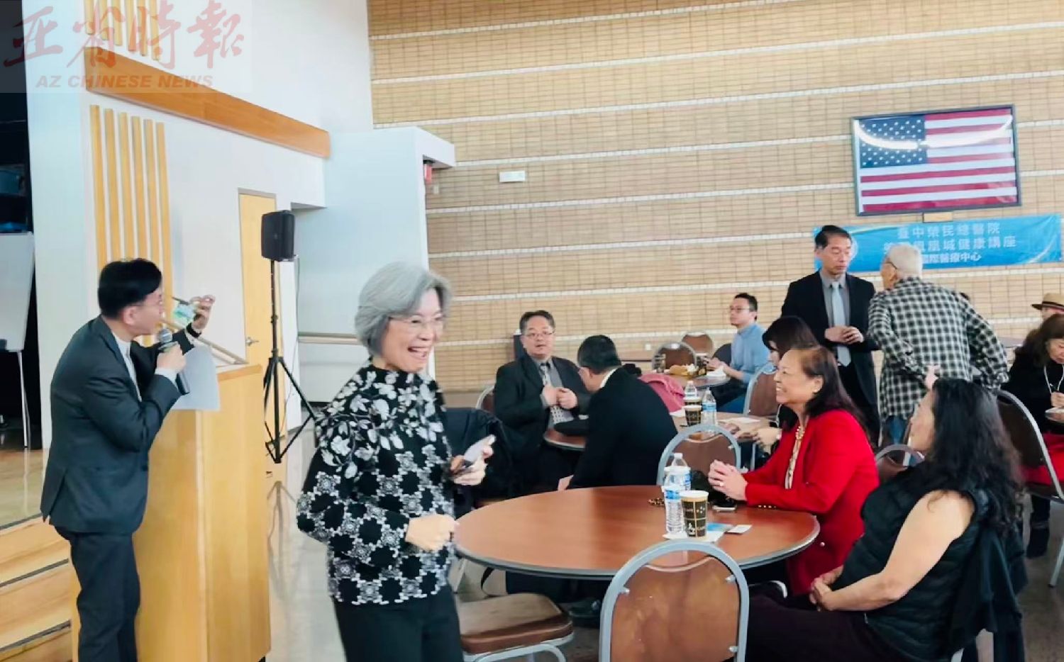 【本報訊】李真報道,阿鳴攝影:為促進台美社區對現代醫療與預防醫學的認識,台中榮民總醫院副院長周元華博士近日率醫療團隊赴美,與鳳凰城台美商會、榮光聯誼會於上週六共同舉辦專題健康講座。榮光會會長王瑞瑾,總幹事陳彩屏等一早親自佈置會場,接送各位醫師,親力親為。講座由台美商會副會長鄭弘主持,活動吸引許多僑胞與專業人士參與,現場反應熱烈。
