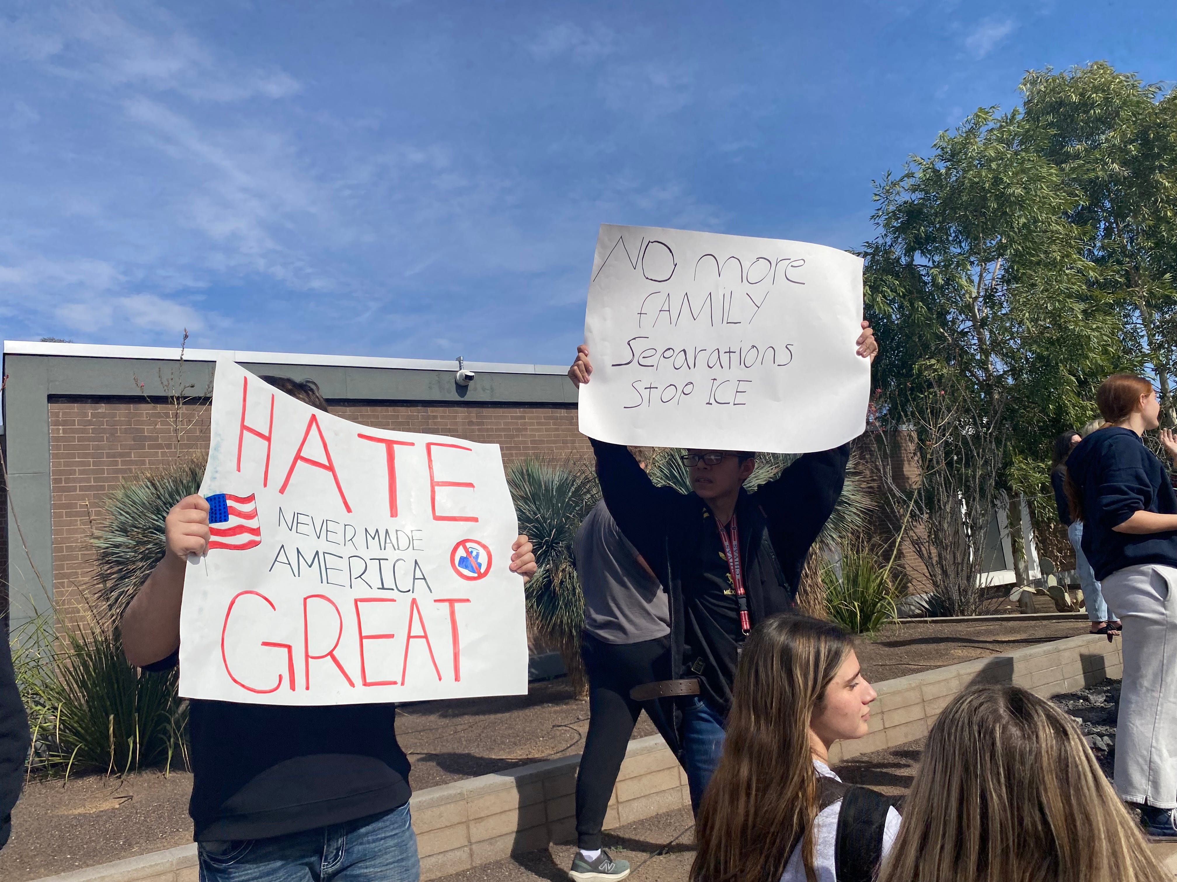 今天,州内从大学到高中均有学生参与。清晨起,Agua Fria联合学区多所高中以及ASU相继出现学生走出课堂的情形。部分学生在校外集结,举着反对ICE的标语,高呼口号,表达对移民家庭处境的关切。