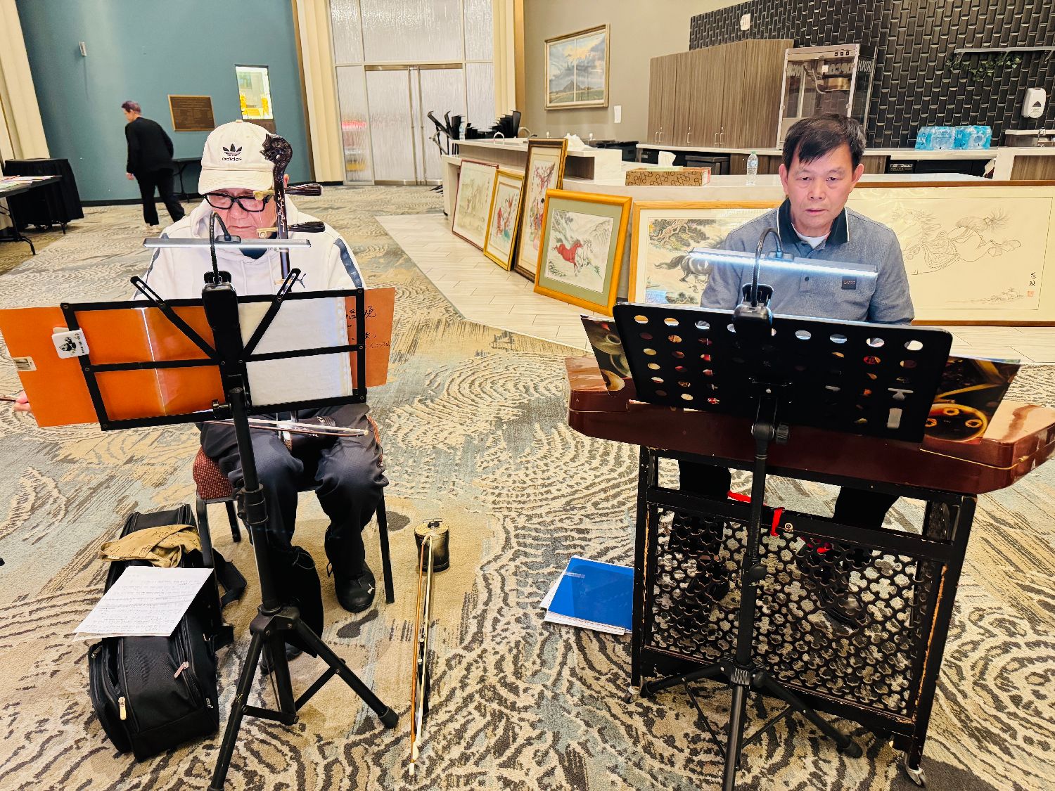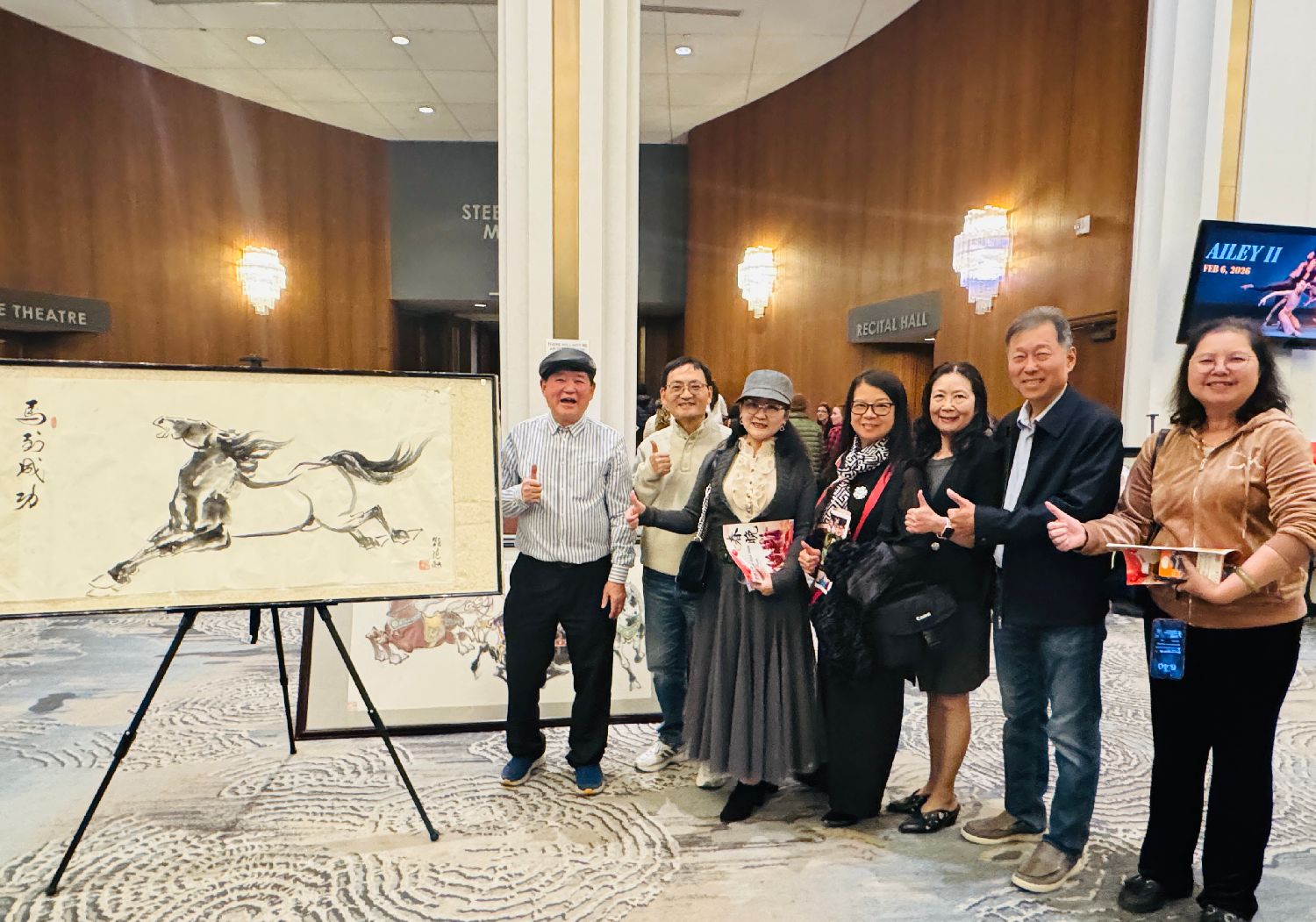 晚会开始前,剧院大堂还举办了迎春文化活动:长者团体载歌载舞,展现银发风采;历代皇室服饰秀华美登场,带领观众穿越时空感受传统礼仪之美。绘画艺术区呼应马年主题,集中展出以“马”为题的作品;绘画大师范融现场进行画马示范与展示,让观众近距离领略笔墨神韵与传统艺术的魅力。