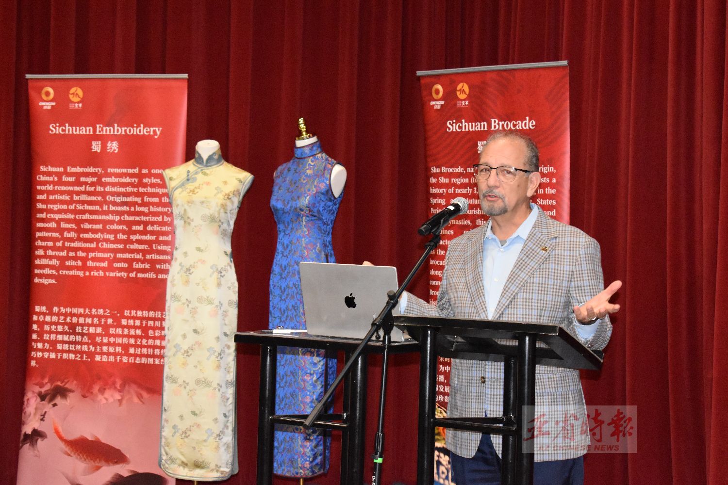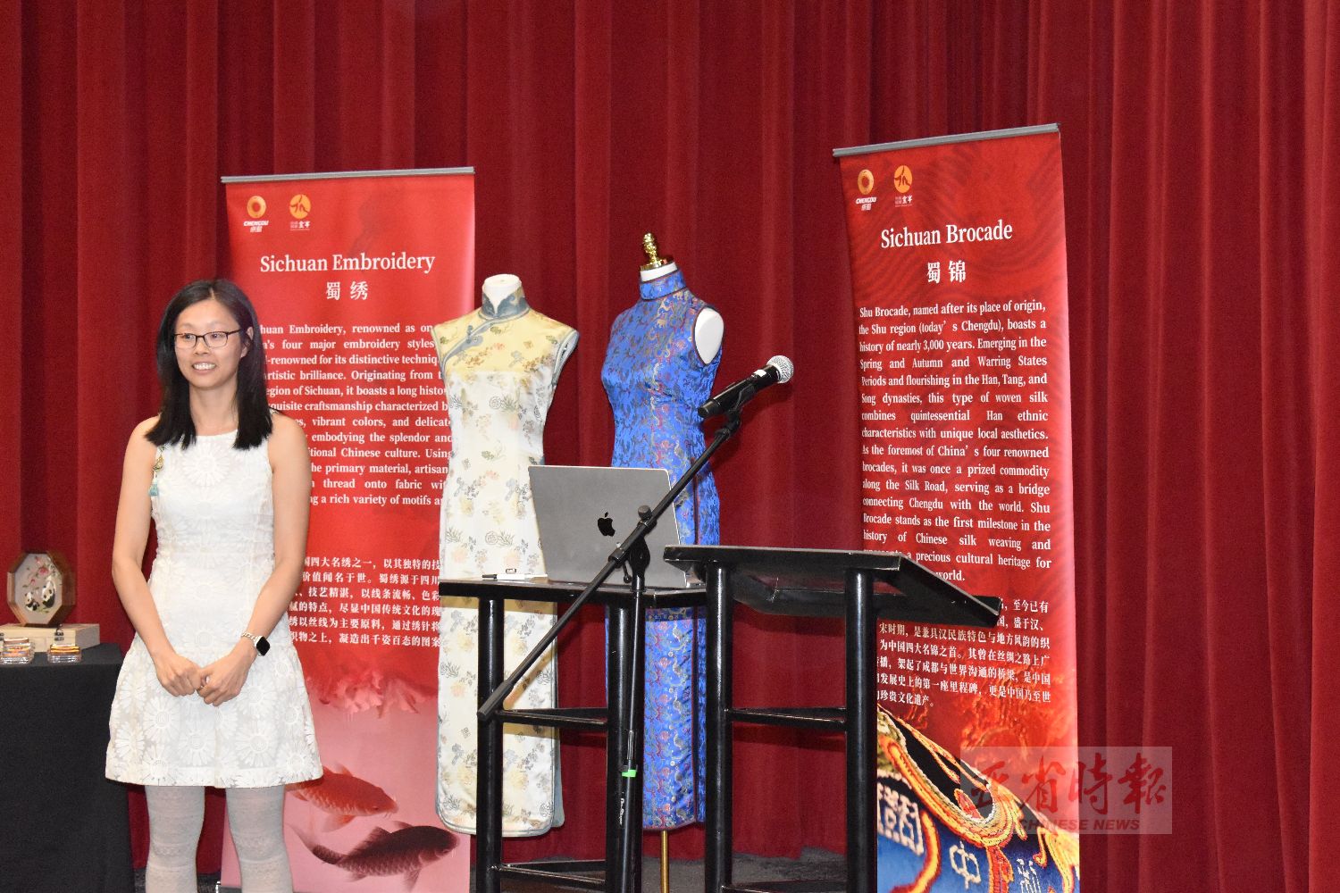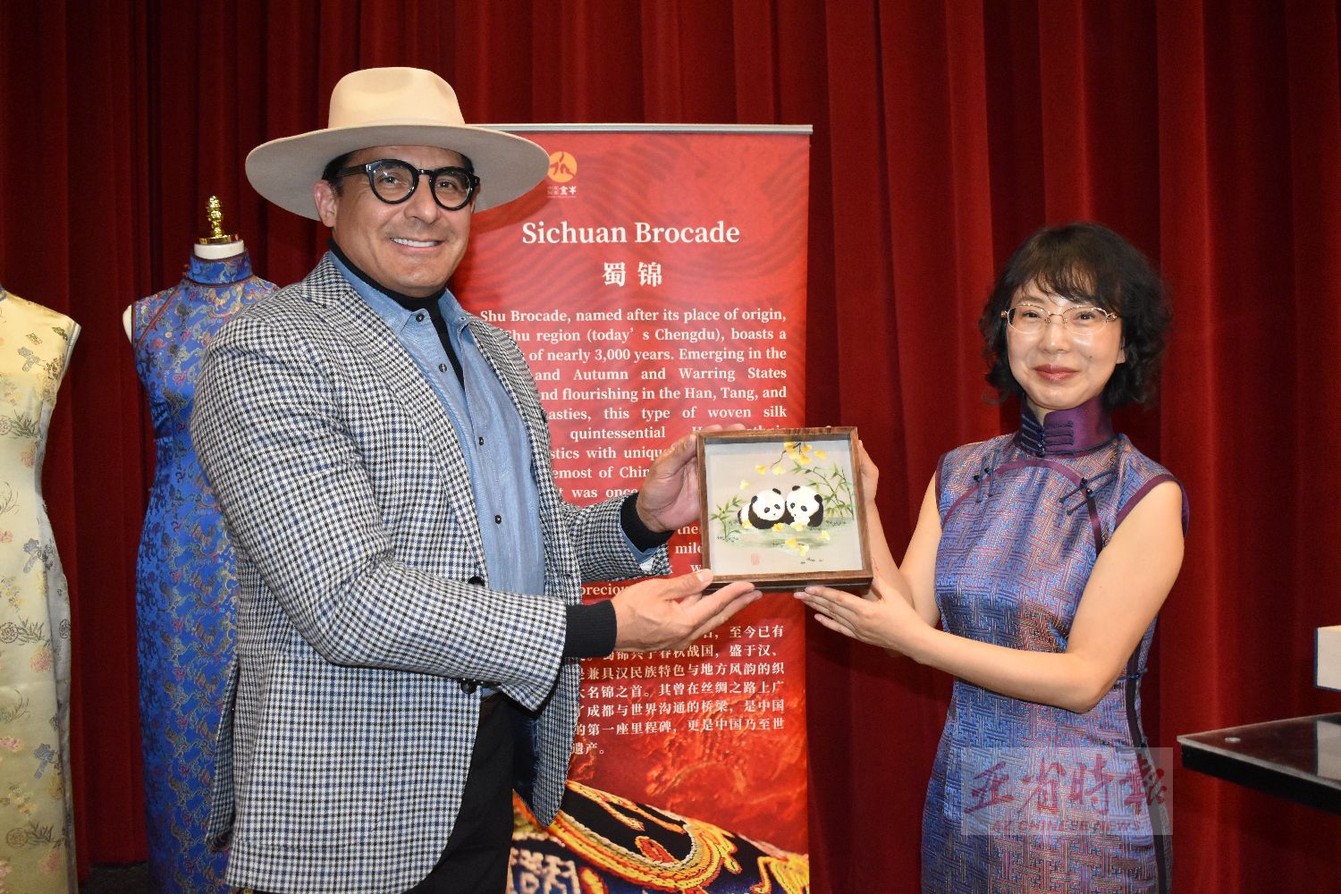 招待会由中国周副主席陈华聪支持,招待会展台陈列了蜀绣非遗典藏、蜀颉扎染扇、蜀锦非遗翻花、文化皮玩、非遗蜀锦手作、中国和合香手串等精品佳作。张庆主任向来宾娓娓讲述成都的历史底蕴、发展前景与城市新貌,并重点介绍中心城区金牛区的文化与产业特色。郭向宇设计师着重详细介绍了蜀锦,使来宾深入了解蜀锦的渊源与价值,蜀锦因产于蜀地而得名,已有近三千年历史,兴于春秋战国,盛于汉唐宋,是兼具民族特色与地域风韵的传统织锦,被誉为中国四大名锦之首。它曾沿古代商路远播海外,成为成都联通世界的重要文化纽带,也是中国织锦发展史上的重要里程碑与世界级文化遗产。