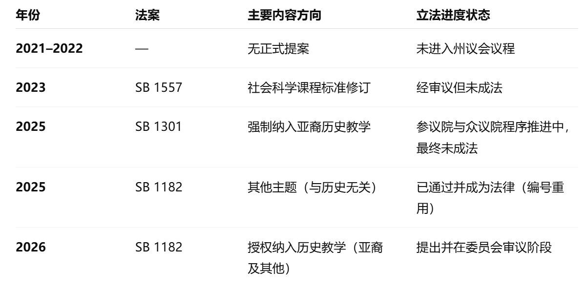 2025年提出的SB1301旨在将亚裔美国人历史纳入州课程标准体系,属于具有结构性调整意味的教育改革尝试。若通过,州教育委员会需对最低课程框架进行修改,各学区必须依规定执行。该法案最终未能成为法律。