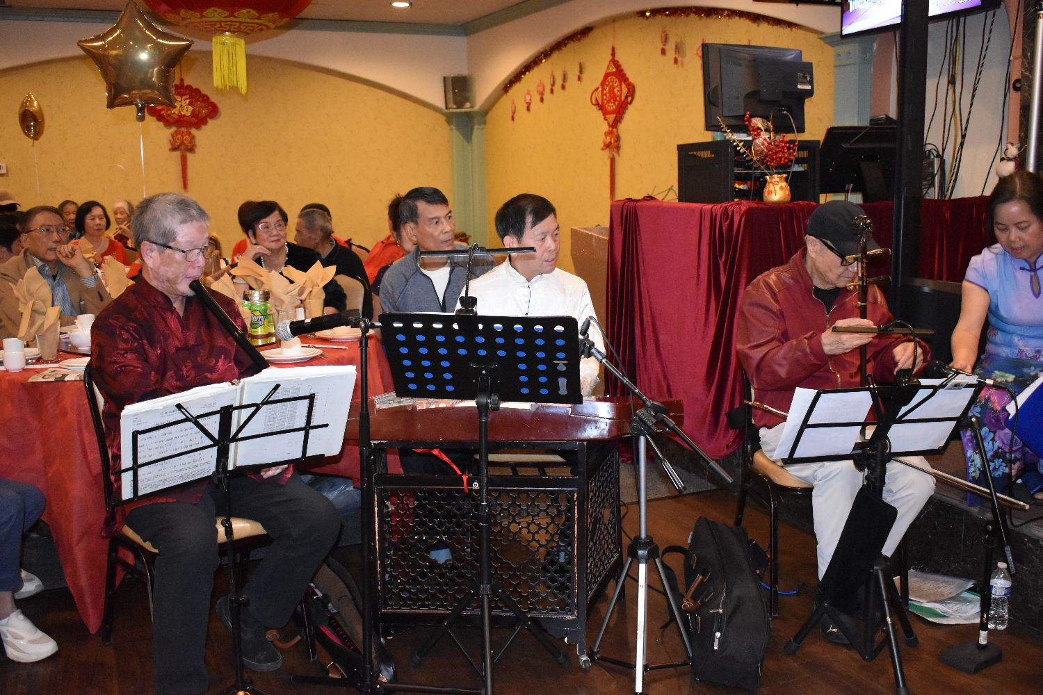 文艺助兴节目丰富多彩,由会长关兆锋特别邀请餐馆会几位好友——徐国富、何恭柏、Raymond Tang、Bobby Cheng联袂献唱经典粤语金曲《上海滩》与《沉默是金》,唱功扎实、感情充沛,勾起大家对旧日时光的回忆。耆英会广东合唱团带来两首动听粤曲,理事黄培领衔广东音乐小组演奏《春郊试马》《雨打芭蕉》,乐声悠扬、古韵悠长;卿卿与Sandy的粤曲对唱《南唐残梦》选段婉转动听,陈孟加、苏根齐对唱《锦江诗编》选段情真意切;甄丽贞一曲小曲独唱《红棉赞》高亢激昂,博得满堂喝彩与热烈掌声。