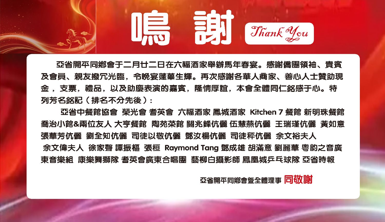 此次马年春宴不仅是开平乡亲的年度团聚,更是传承乡情、弘扬粤港文化的生动实践。亚省开平同乡会将继续凝聚乡亲力量,促进社区交流与互助,为亚利桑那州多元文化增添一抹温暖的“开平红”。