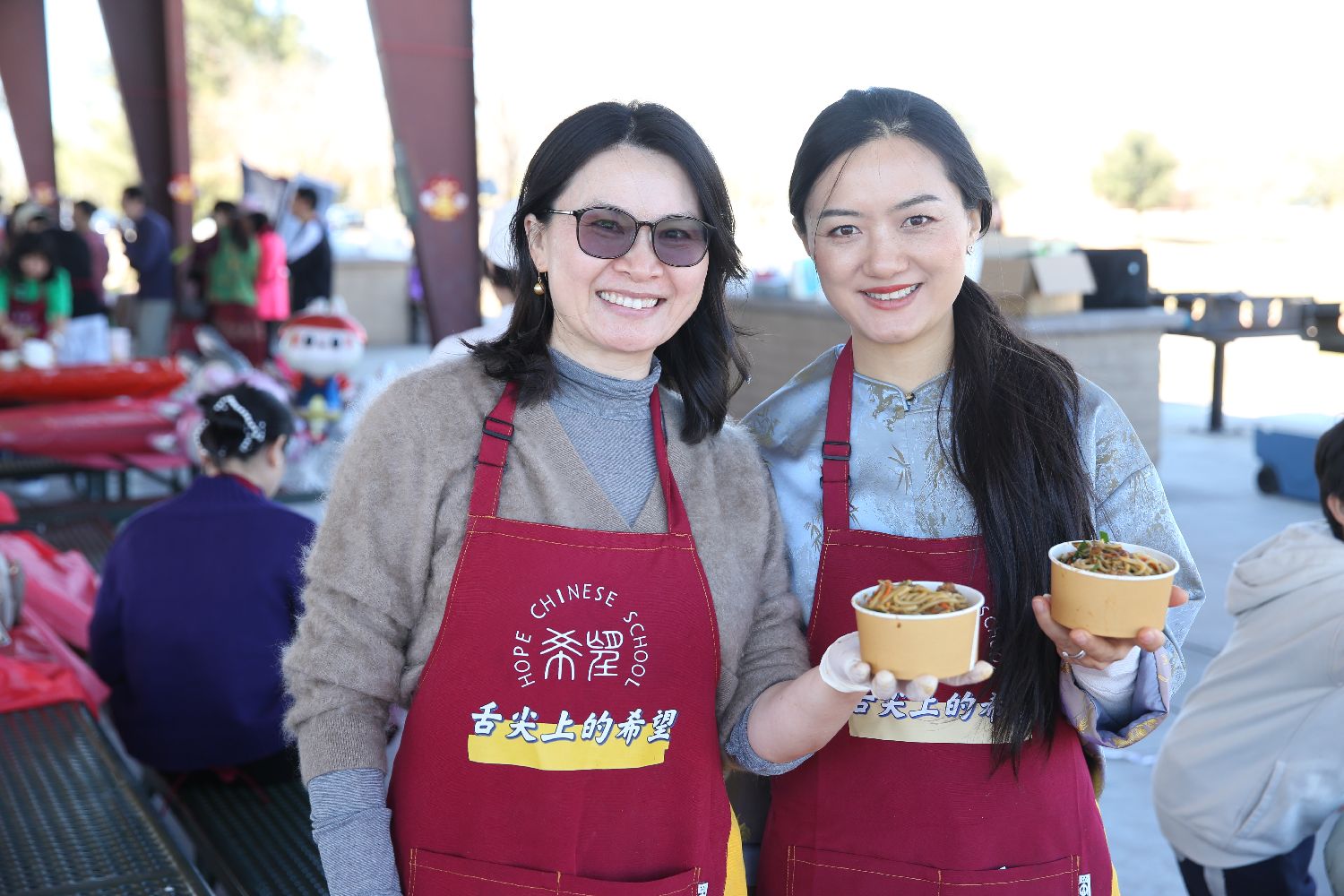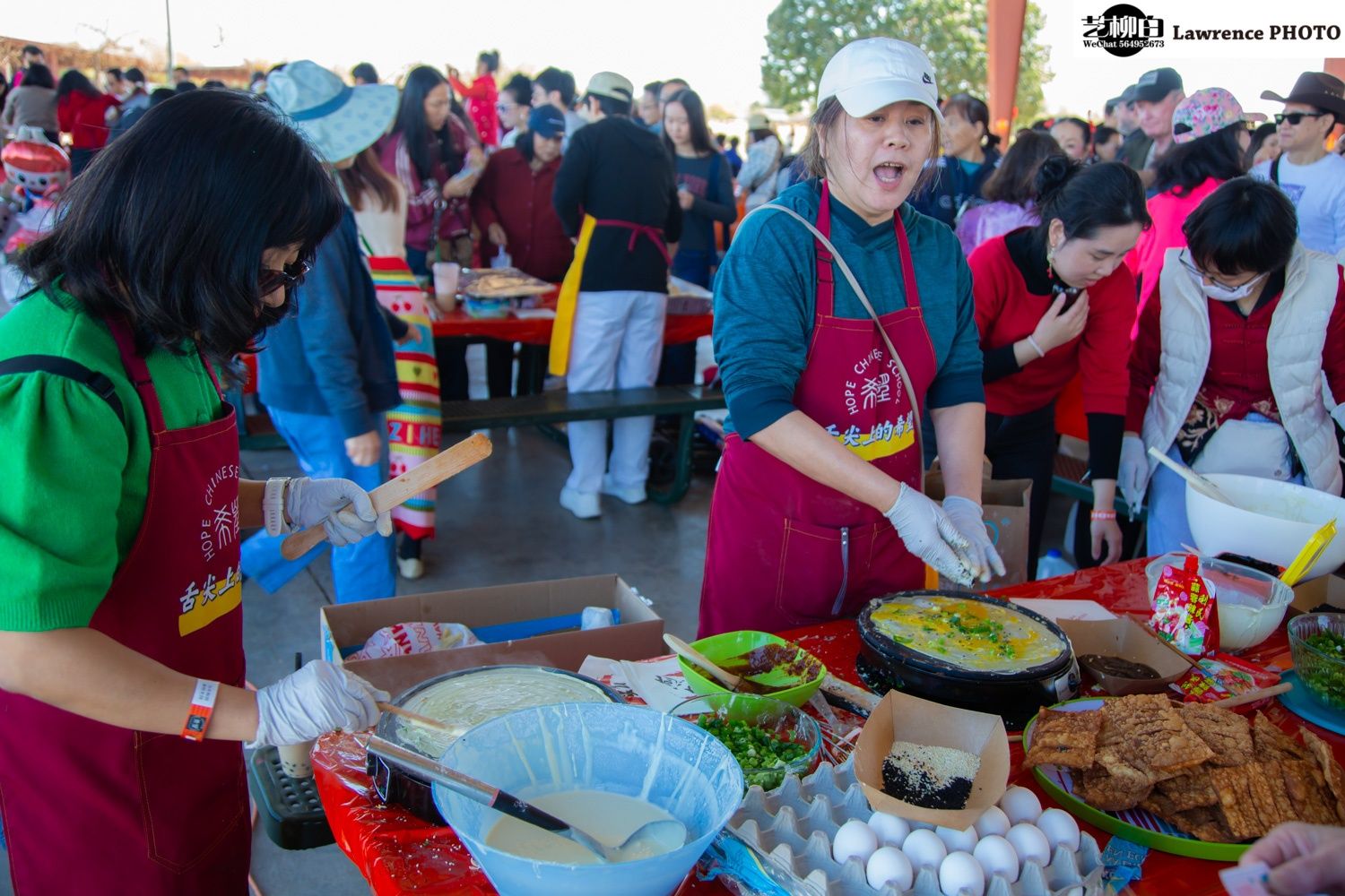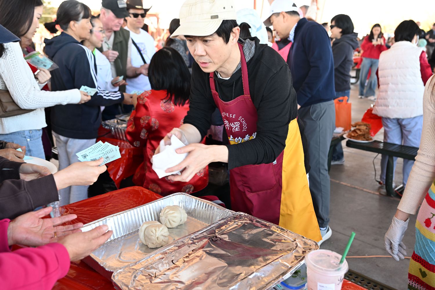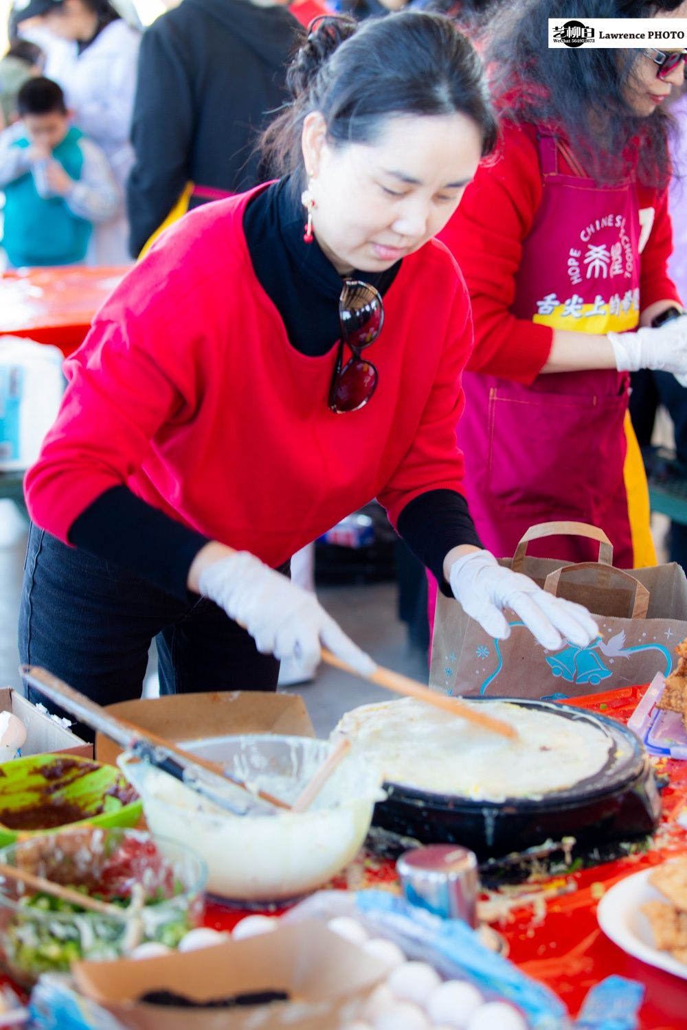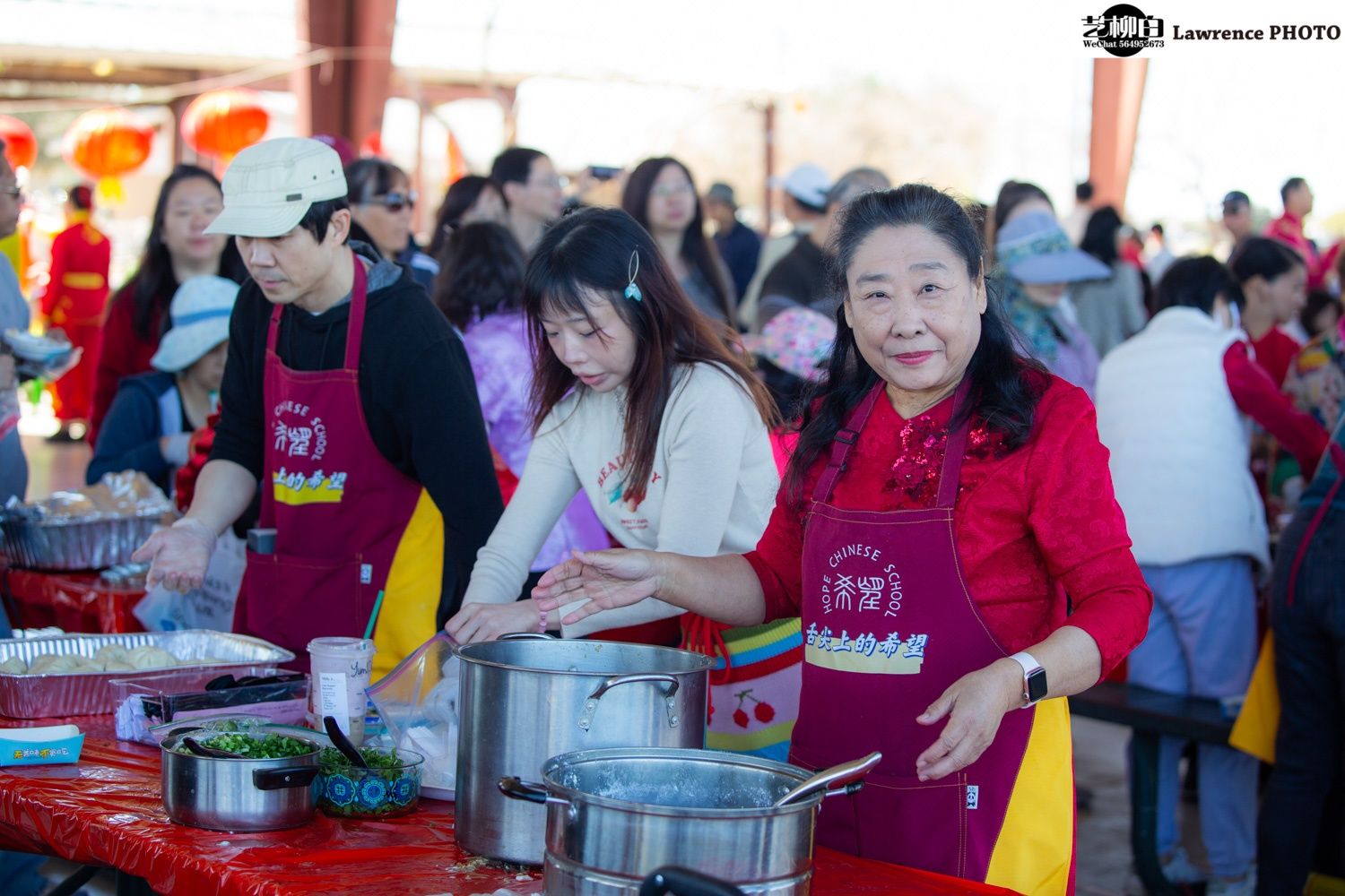 赫赫有名的包子陈和夫人亚莉一起,在总统日那天做了一整天的包子,还不够;此后每天下了班就做包子冻上,一直到庙会前夕。前校长田琳不仅请了许多老友出山,自己也是亲自上阵。前晚忙着改刀春卷皮,当日守着煎饼摊连轴转。行政校长Emily切葱切了一上午,手上都起了水泡。还有喷香的肉夹馍,都得提前一个个烙好,彩红校长和队友们为此忙活许久。庙会前夜正是不眠夜,灯火处,多少义工们准备食材到凌晨。这样的事例不胜枚举,种种辛劳不言而喻。尽管如此,大家认为这样值得。散场之后,义工们才有空填填肚子,聚在摊前笑谈温馨时刻:人们在排队中如何与大厨话家常,不少人又如何旁敲侧击求菜谱,可见味美啊。前校长田琳就说:“看到孩子们玩得开心,家长们吃得满意,所有的付出感觉都是很值得的。十几年前学校开始办庙会的初衷就是希望在美国出生长大的孩子们能够通过这样的集体活动感受到中国春节的热闹和喜庆。”