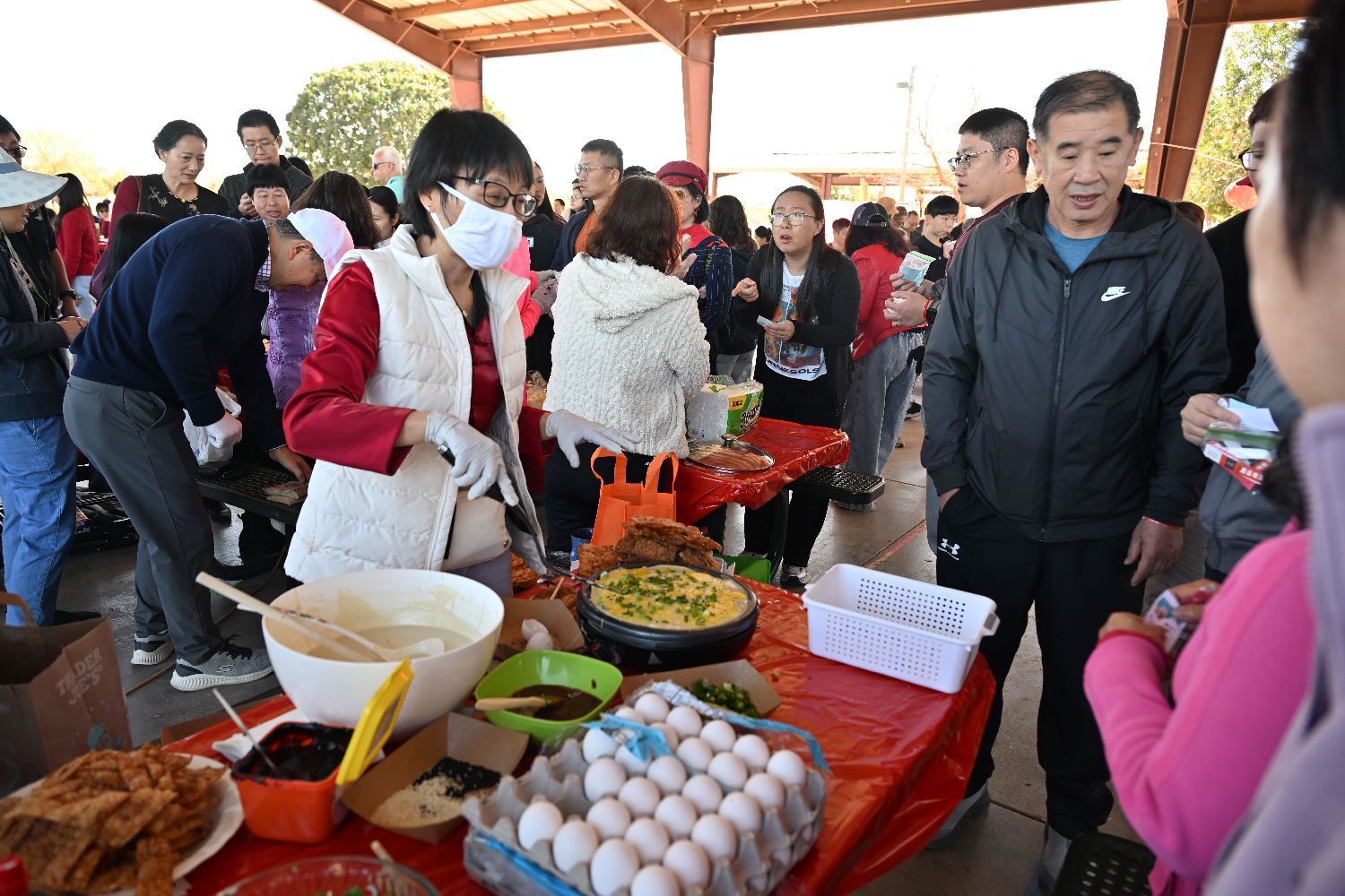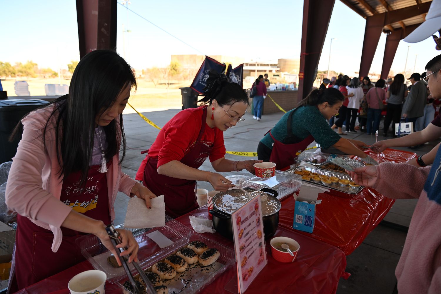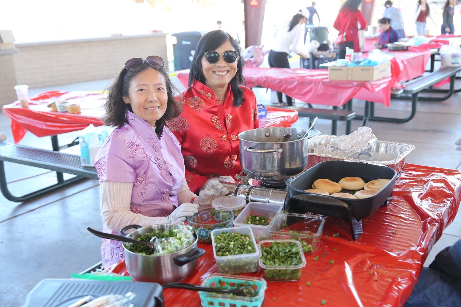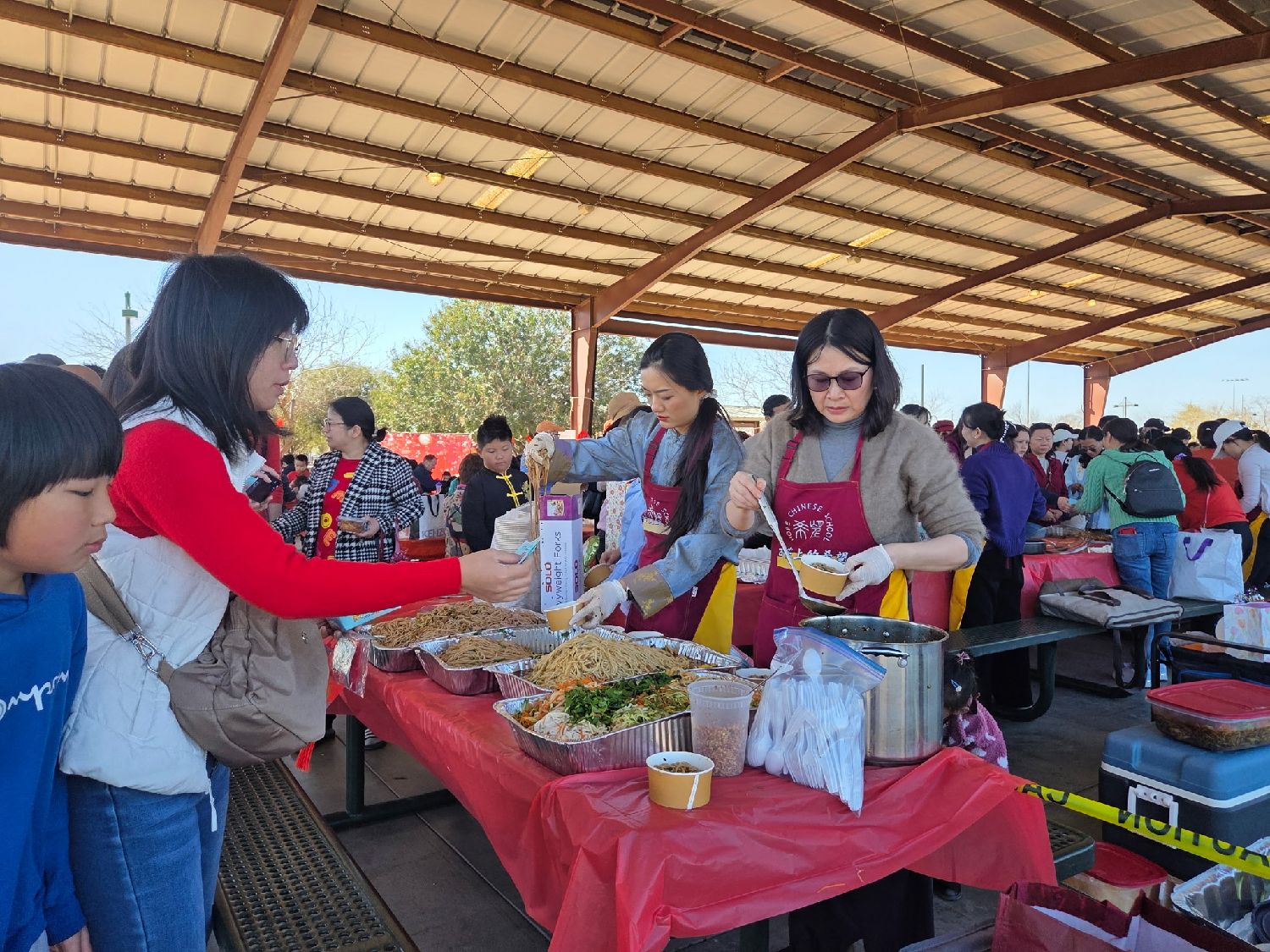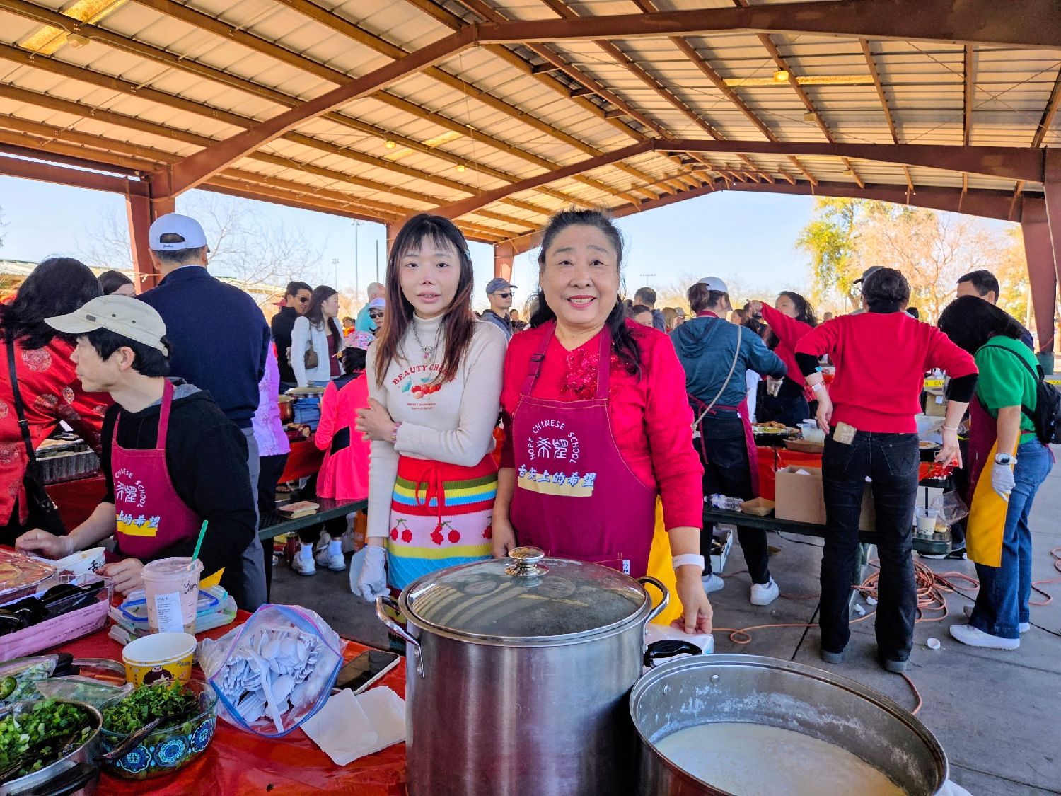 赫赫有名的包子陈和夫人亚莉一起,在总统日那天做了一整天的包子,还不够;此后每天下了班就做包子冻上,一直到庙会前夕。前校长田琳不仅请了许多老友出山,自己也是亲自上阵。前晚忙着改刀春卷皮,当日守着煎饼摊连轴转。行政校长Emily切葱切了一上午,手上都起了水泡。还有喷香的肉夹馍,都得提前一个个烙好,彩红校长和队友们为此忙活许久。庙会前夜正是不眠夜,灯火处,多少义工们准备食材到凌晨。这样的事例不胜枚举,种种辛劳不言而喻。尽管如此,大家认为这样值得。散场之后,义工们才有空填填肚子,聚在摊前笑谈温馨时刻:人们在排队中如何与大厨话家常,不少人又如何旁敲侧击求菜谱,可见味美啊。前校长田琳就说:“看到孩子们玩得开心,家长们吃得满意,所有的付出感觉都是很值得的。十几年前学校开始办庙会的初衷就是希望在美国出生长大的孩子们能够通过这样的集体活动感受到中国春节的热闹和喜庆。”