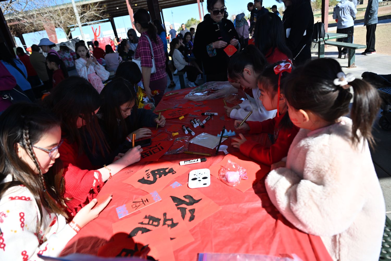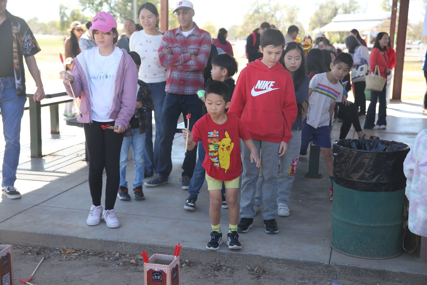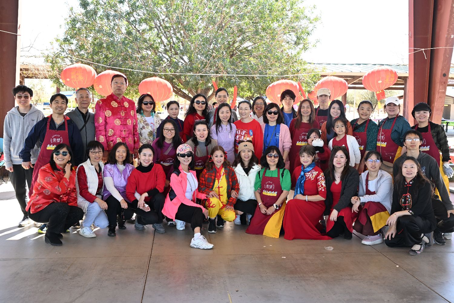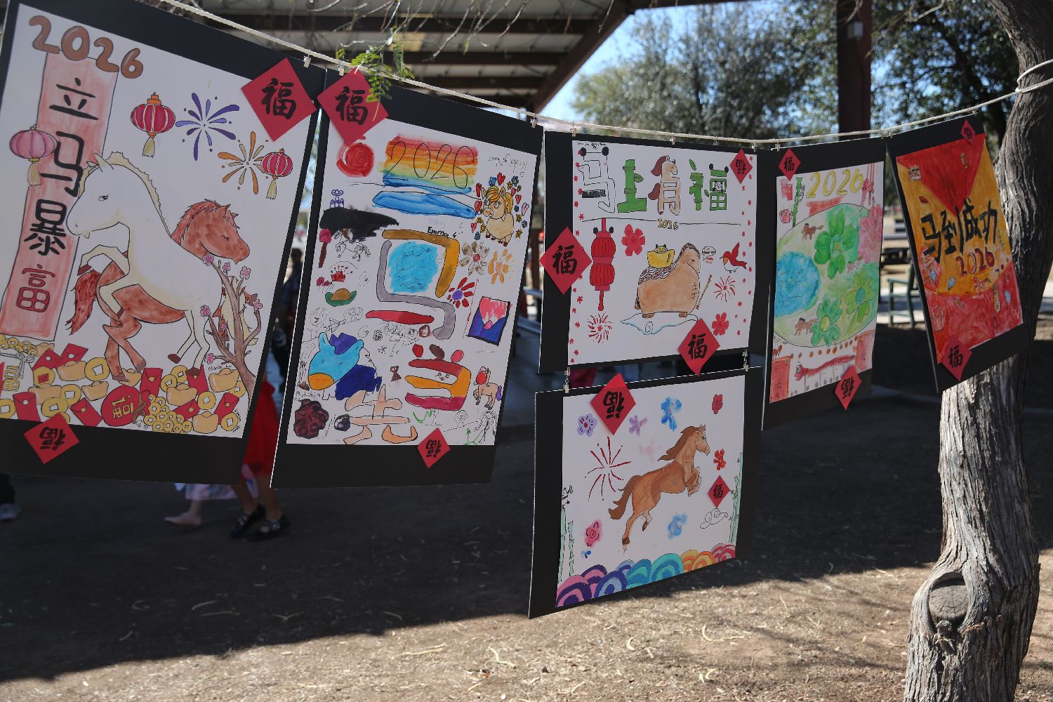 销魂饱腹,当此际!喧天的鼓声让人精神一振。英姿飒爽,彩扇飞舞,原来是腰鼓队的开场。紧接着,孩子们的Soda Pop,朝气蓬勃,老师们的拉丁舞,热情奔放,多姿多彩的才艺秀让人目不暇接。中午,主持人徐雪涛老师首先向大家拜了年。随后李健董事长在讲话中,盛赞了庙会的总指挥史敬嵬。我们的嘉宾CGCC校长CJ Wurster致辞中高度评价与希望中文学校长达十年的合作伙伴关系,並期待今后的长期合作发展。亚省地产赵鹏辉先生作为众多赞助本次庙会的机构与个人之一也致了辞。这场新春庙会非常荣幸地获得了广大社区的支持,包括AZ Community Foundation、AZ方太厨电、极光财富、赵鹏辉先生、舒之味、Top One Hot Top Asian Cuisine、南北小厨、Linda女士等等。接下来,自然是孩子们最开心的时刻。小朋友们欢蹦乱跳地排着长龙领红包,也领上一份新春的祝福。最后的压轴戏是新年福运大抽奖。咱们幸运的义工们,还穿着围裙呢,乐滋滋地上前领奖,全场笑声掌声阵阵,同喜同乐。