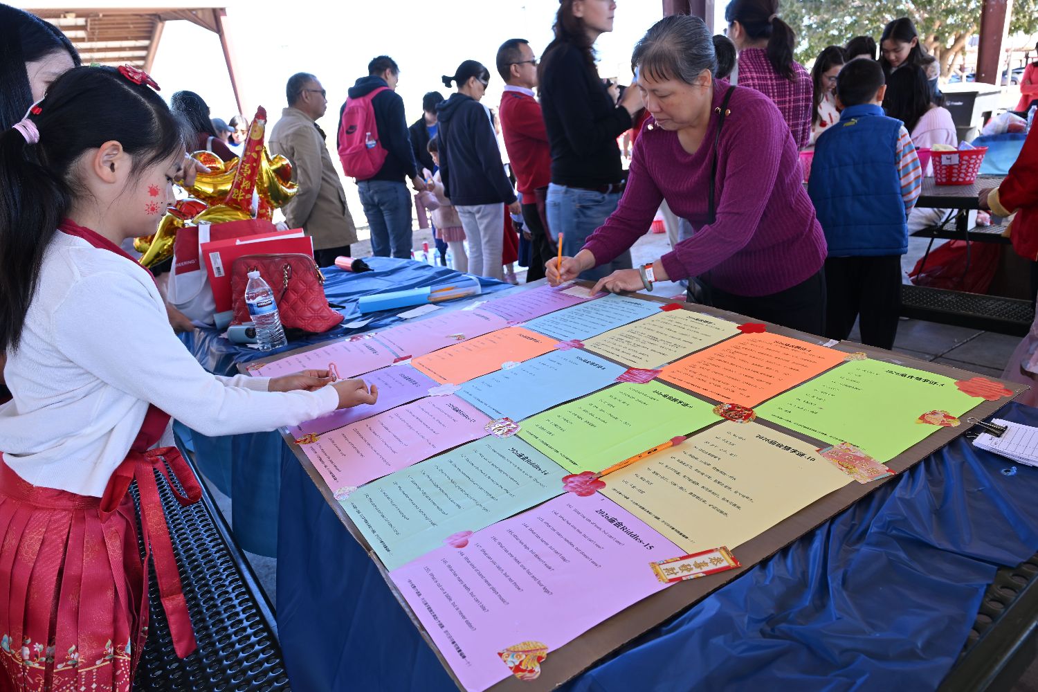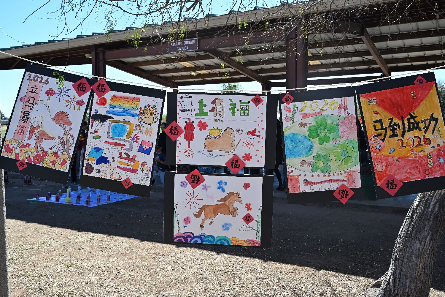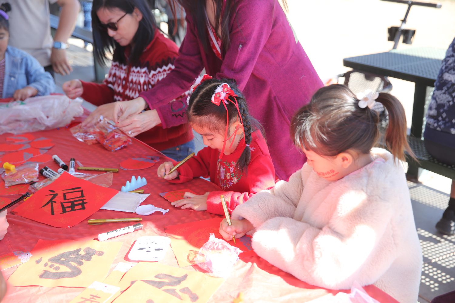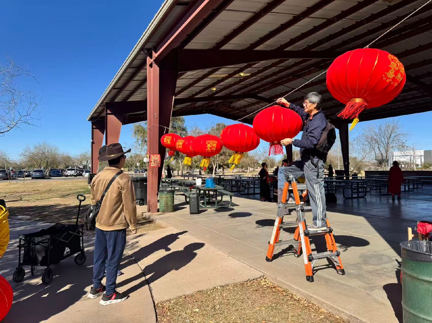 二月二十一日,大年初五。Tumbleweed公园早早热闹起来,亚省希望中文学校的老师和义工们开始准备新春庙会。这边李健董事长和黄冰董事合作,蹬着高高的梯子,悬挂节日灯笼和彩带。那边活动组的老师们纷纷布置游戏展台。套圈组的孩子们也颇为忙碌,把饮料、套圈和各种奖品摆放到位。很快,亭子门梁高悬着红色的灯笼,四周柱子贴满福字和年画,桌上是彩色谜语和剪纸,还有金灿灿的福棒和火红的龙。瞧,年已至!
