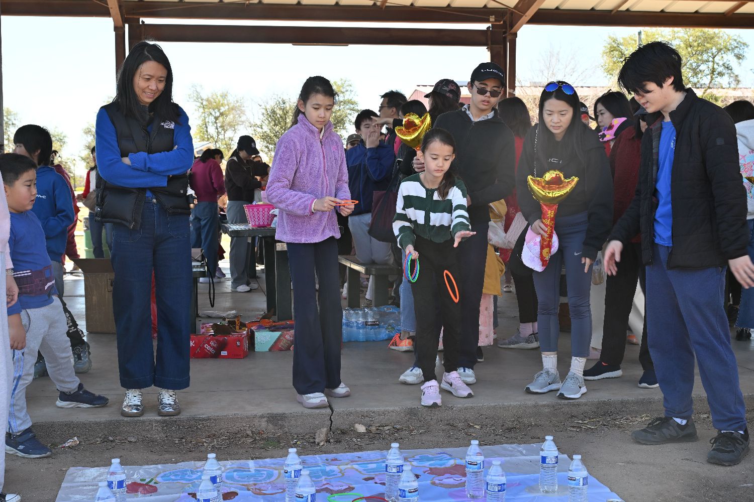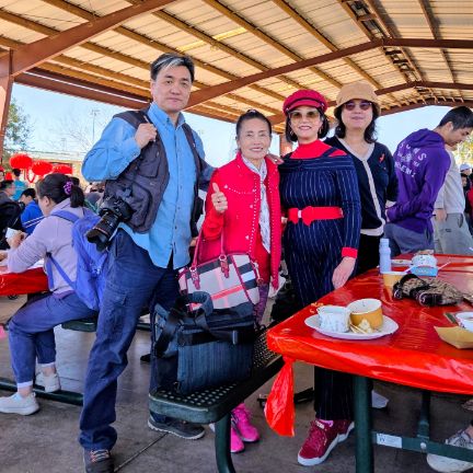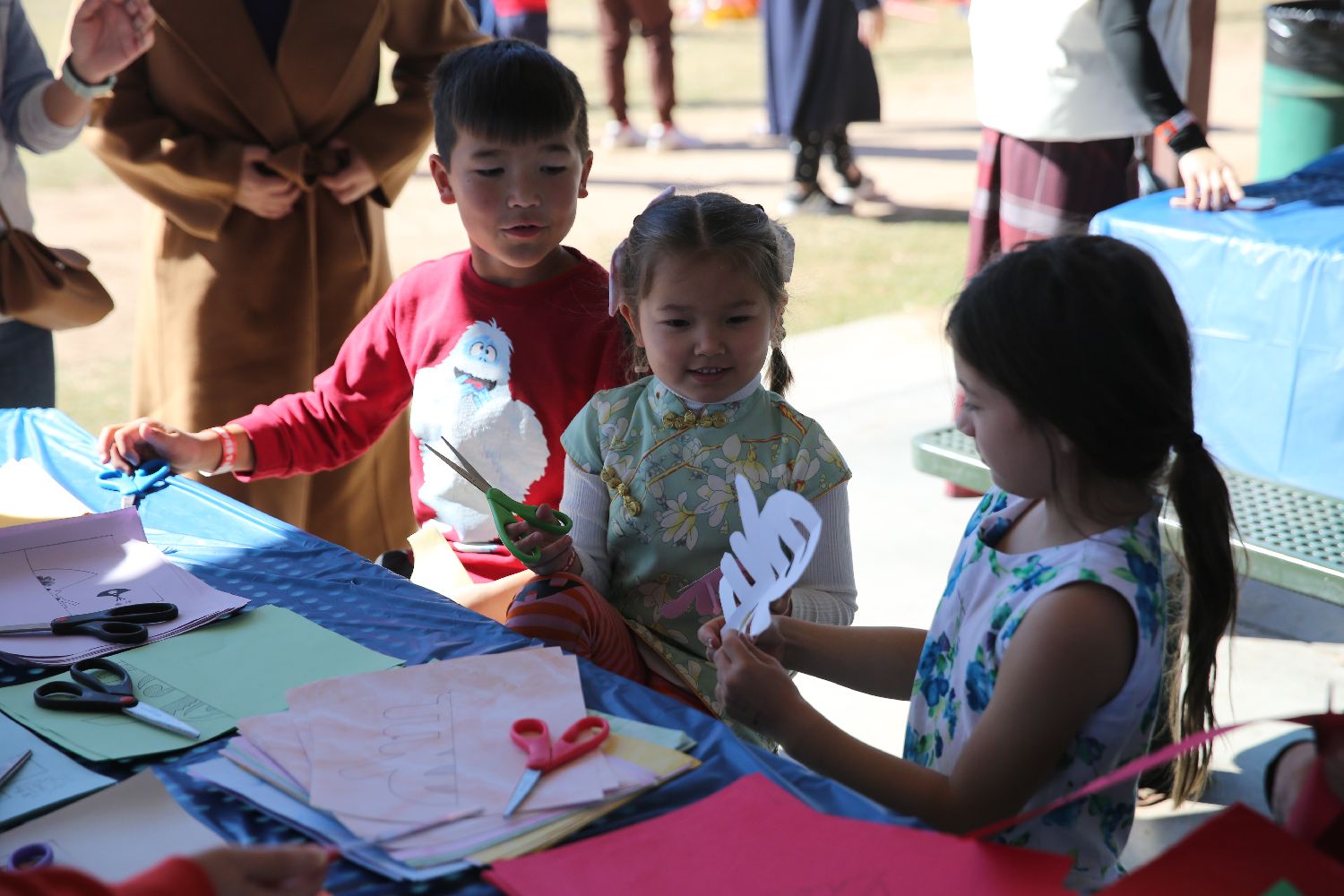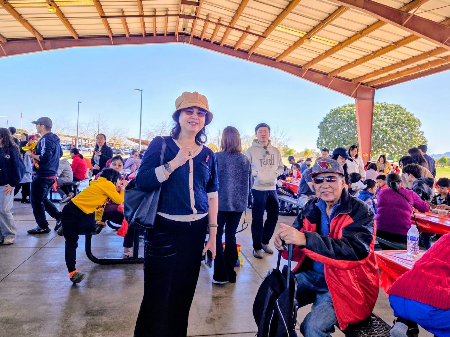 二月二十一日,大年初五。Tumbleweed公园早早热闹起来,亚省希望中文学校的老师和义工们开始准备新春庙会。这边李健董事长和黄冰董事合作,蹬着高高的梯子,悬挂节日灯笼和彩带。那边活动组的老师们纷纷布置游戏展台。套圈组的孩子们也颇为忙碌,把饮料、套圈和各种奖品摆放到位。很快,亭子门梁高悬着红色的灯笼,四周柱子贴满福字和年画,桌上是彩色谜语和剪纸,还有金灿灿的福棒和火红的龙。瞧,年已至!