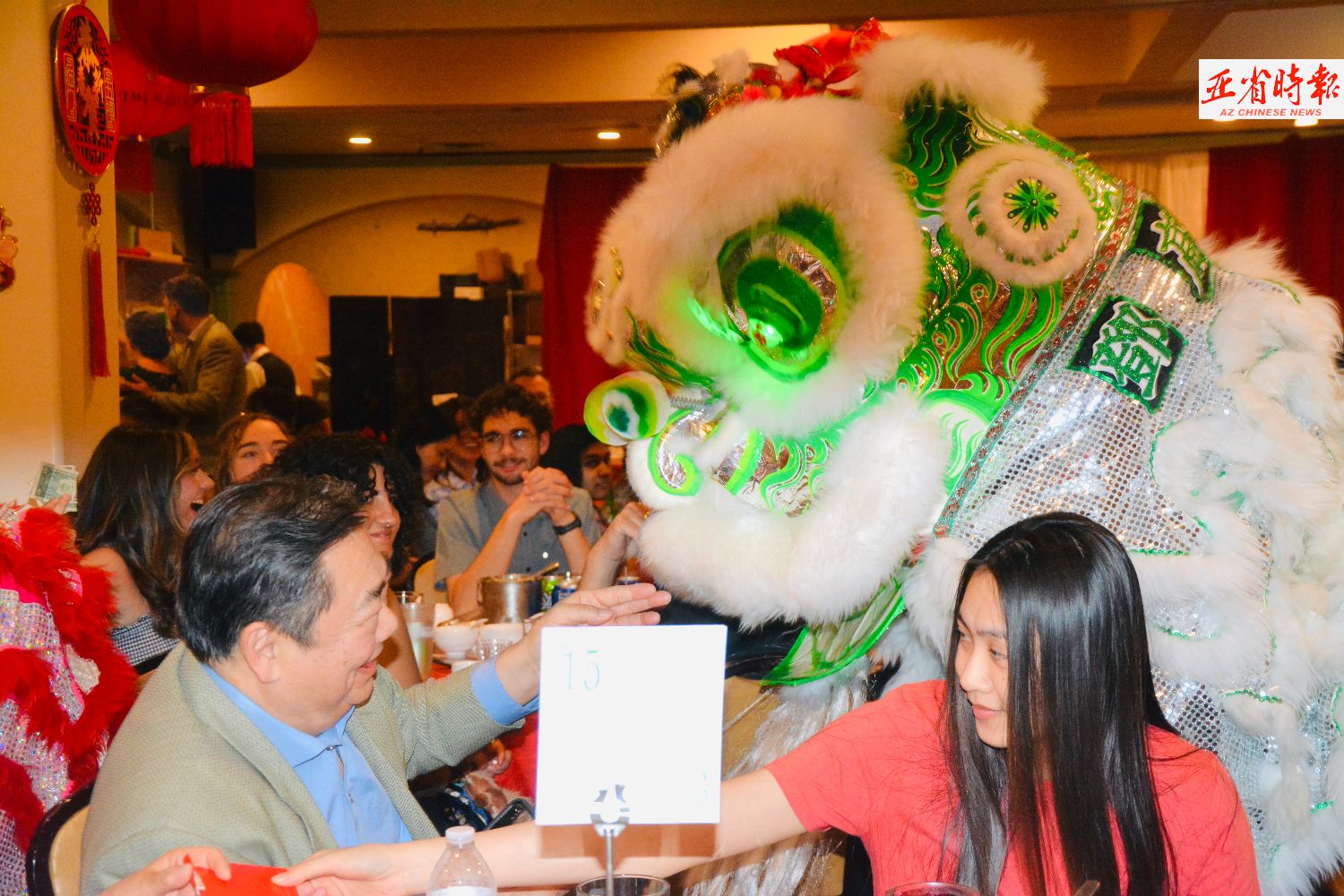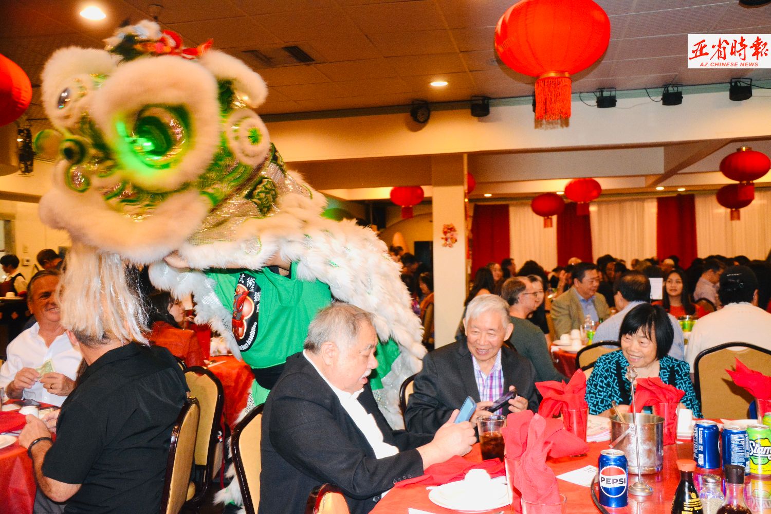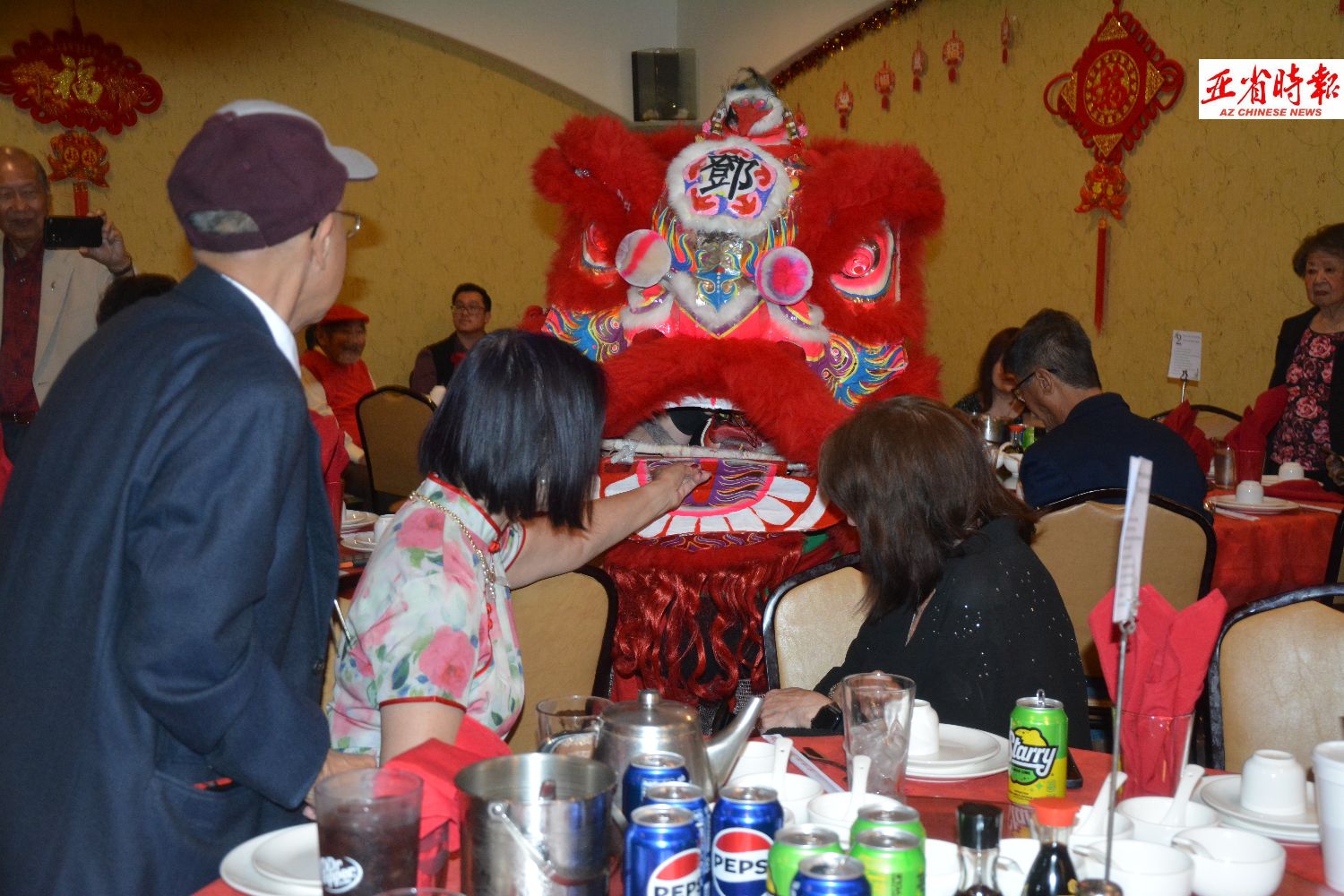 入夜,春宴在六福酒家盛大开席。锣鼓齐鸣,两头分别绣有“邓高密”字样的红绿醒狮在场中欢腾起舞,向宾客献上新春祝福,并接受来宾派发的红包利是,现场顿时洋溢着浓浓的节庆喜气。