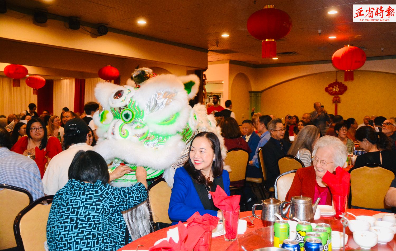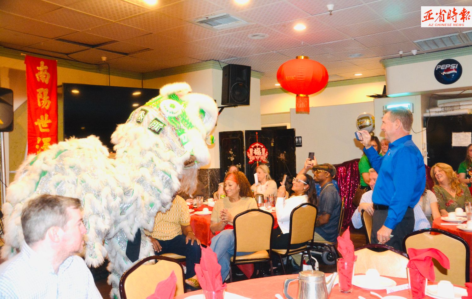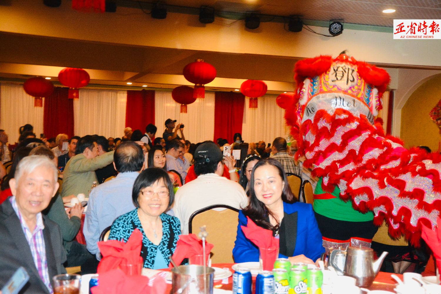 入夜,春宴在六福酒家盛大开席。锣鼓齐鸣,两头分别绣有“邓高密”字样的红绿醒狮在场中欢腾起舞,向宾客献上新春祝福,并接受来宾派发的红包利是,现场顿时洋溢着浓浓的节庆喜气。