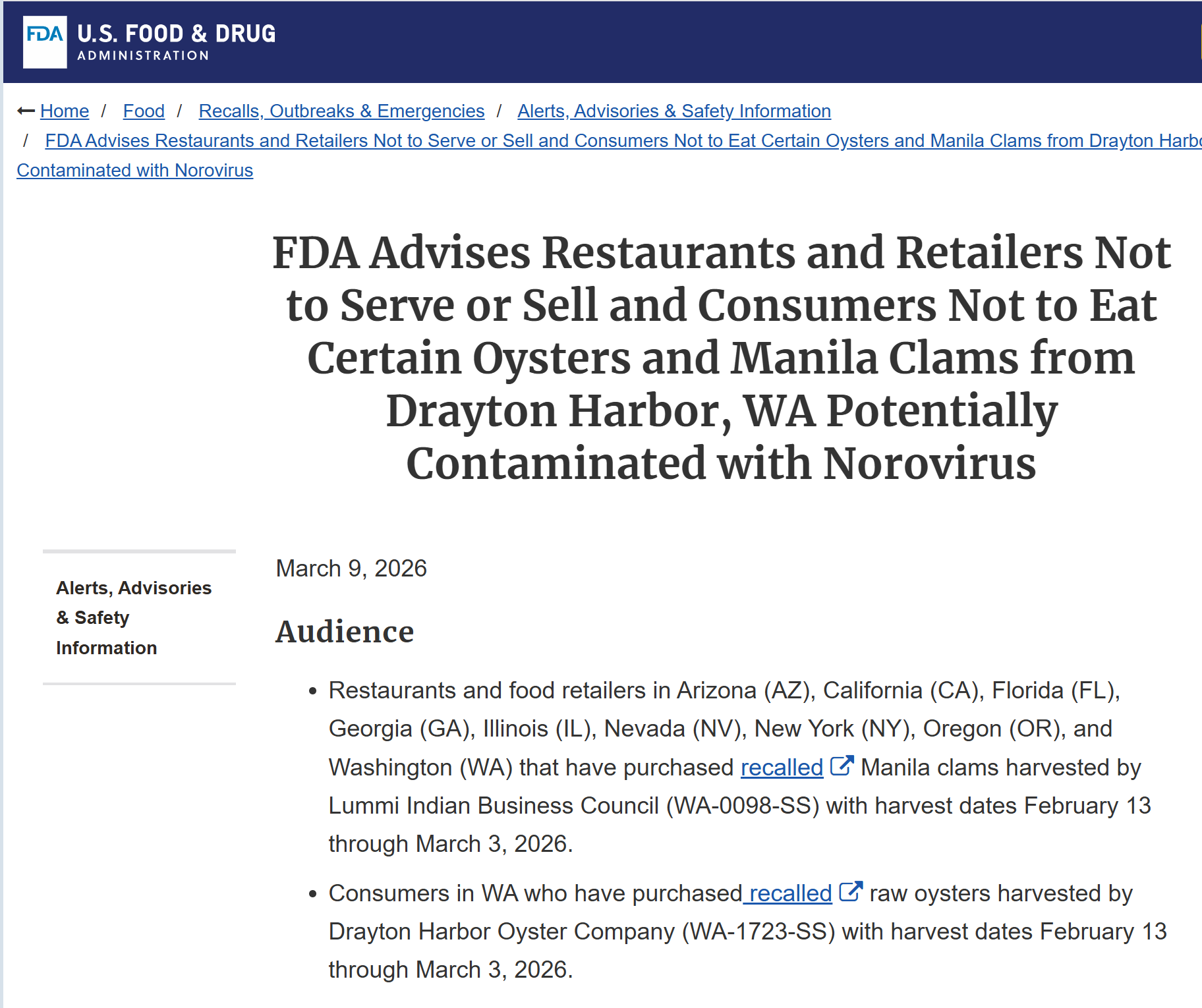 FDA发布警示,建议餐厅和食品零售商不要供应或销售由德雷顿港牡蛎公司捕捞的某些生牡蛎,以及由卢米印第安商业委员会捕捞的马尼拉蛤蜊,并建议消费者不要食用这些产品。