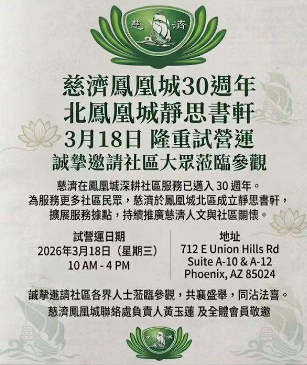 【本報鳳凰城訊】慈濟功德會於鳳凰城深耕社區服務已正式邁入第30個年頭。為進一步擴大服務範疇、回饋在地民眾,慈濟宣布於北鳳凰城地區成立全新的「靜思書軒」,並定於2026年3月18日(星期三)舉行隆重的試營運啟動儀式,誠摯邀請社區大眾蒞臨參觀,共同見證這份溫暖的成長。