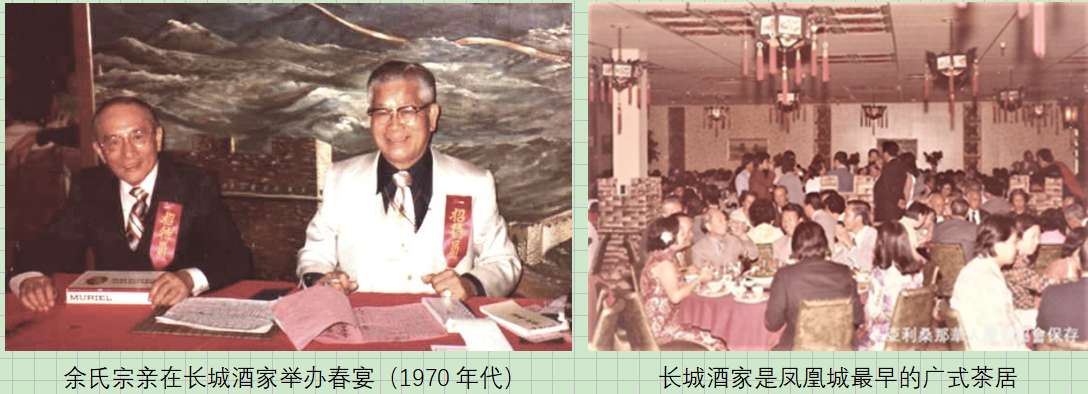 长城酒家也是凤凰城最早的茶居,那时还未有点心师傅,每逢周末,半成品的点心是从夏威夷空运而至的,蒸熟就可出售,本地华人自此有了饮茶和吃点心的广式茶居。当时不少华人的婚宴、寿宴,以及侨团春宴也在长城酒家举办。
