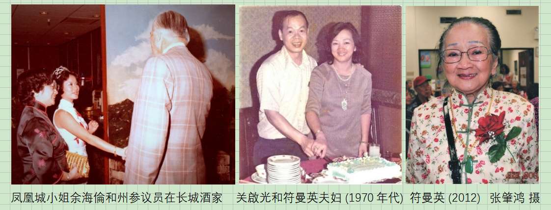 作者也拜访过符曼英女士。1963年,符曼英与丈夫关啟光带着孩子们从香港移居美国,1970年代在凤凰城,之后迁至亚利桑那州的斯科茨代尔(Scottsdale)。她在餐饮界深耕28载,成为一位成功的餐馆经营者。凭借其与生俱来的亲和力,她与许多顾客建立了终生的情谊。她为人乐善好施。捐助教会兴建,捐助家乡海南岛的《符曼英斋》学校,捐助龙冈公所、同源会、侨联及各种公益事业。符曼英女士支持亚利桑那华人历史协会,赞助出版书藉。