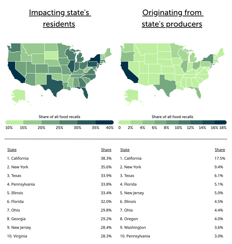 在各州分布方面,食品召回影响存在明显差异。加利福尼亚州以38.3%的召回涉及率位居全美首位,纽约州和德克萨斯州同样排名靠前。相比之下,南达科他州仅为13.9%。