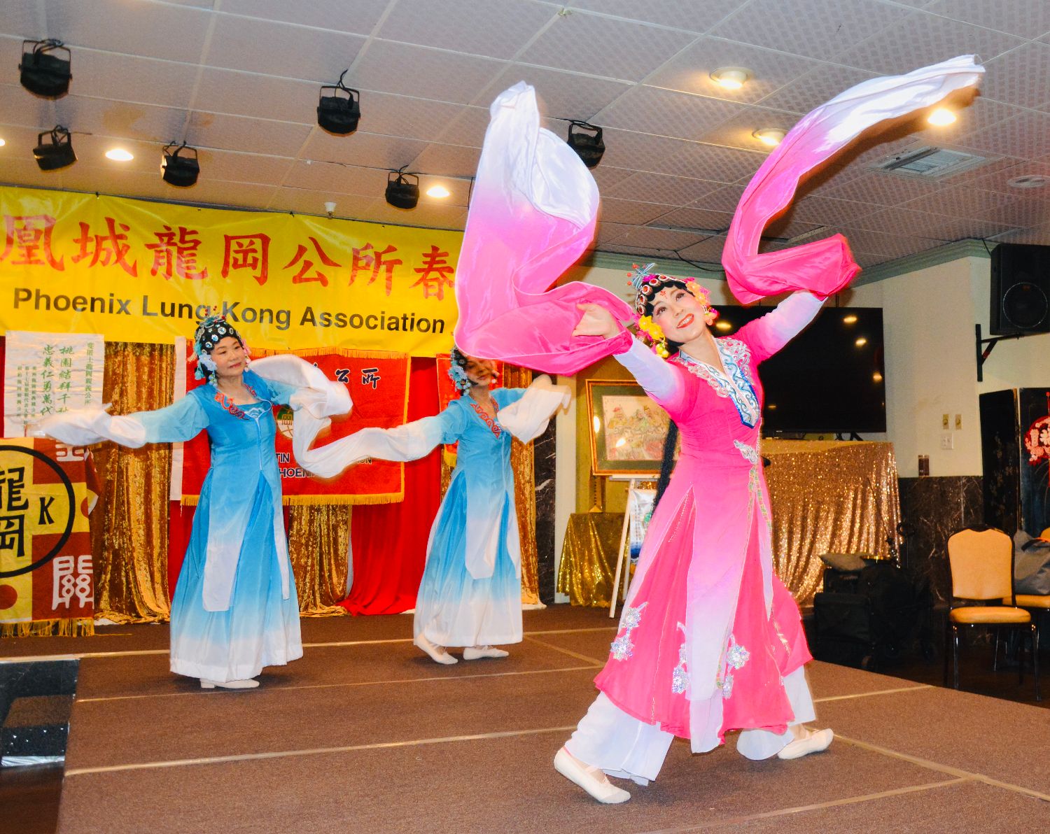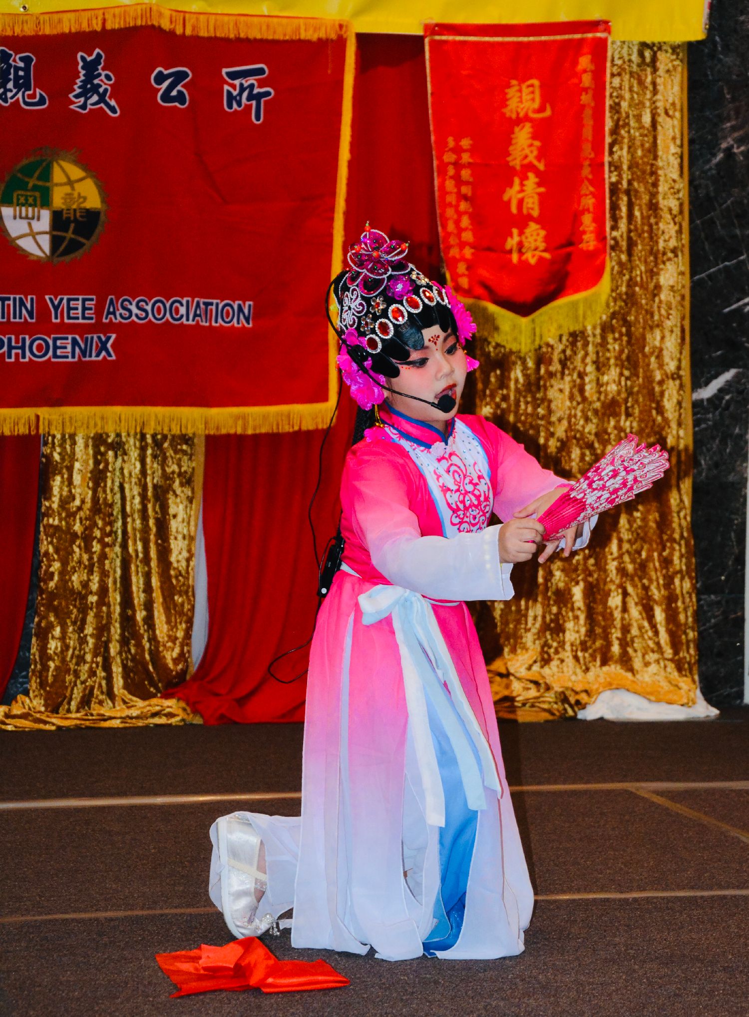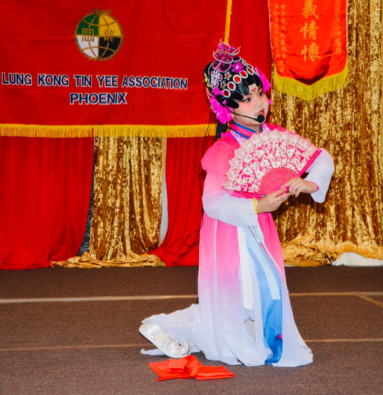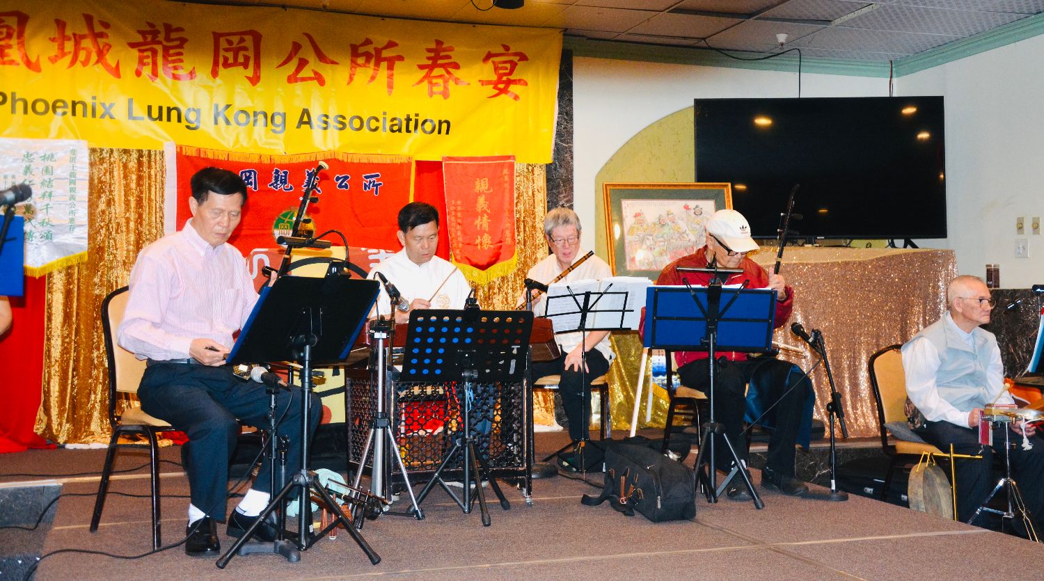 当晚的文娱节目精彩纷呈,副主席关小美与元老张肇鸿以广东方言首先上来一段《马年说马》,以此恭祝大家马年顺遂。今年很难得邀请到凤凰城粤韵曲艺团五位乐师同台演出,他们除了在迎宾时段演奏广东音乐外,还在台上献上《喜洋洋》《娱乐升平》《孔雀开屏》等经典曲目,悠扬悦耳,余音绕梁。在该乐团伴奏下,陈爱卿深情独唱《欢乐年年》,并与陈仲兴师傅对唱《花好月圆》,赢得阵阵掌声。随后,段晓斌与两位搭档一起表演舞蹈《惊鸿舞》,舞姿优雅动人;年仅五岁的凤凰城“小童星”Miya Duan带来京剧唱段《卖水》,童声清澈灵动,博得全场喝彩。