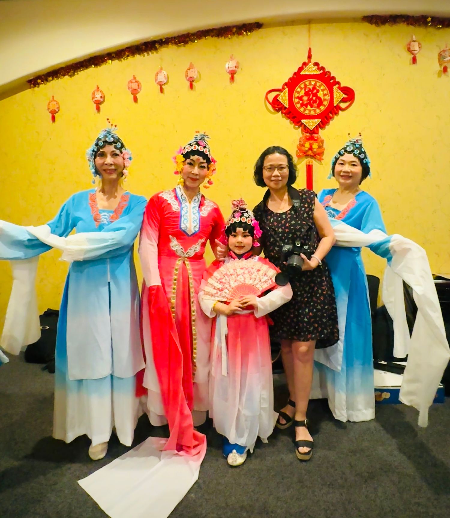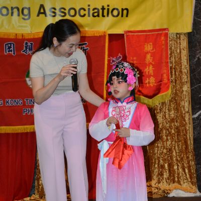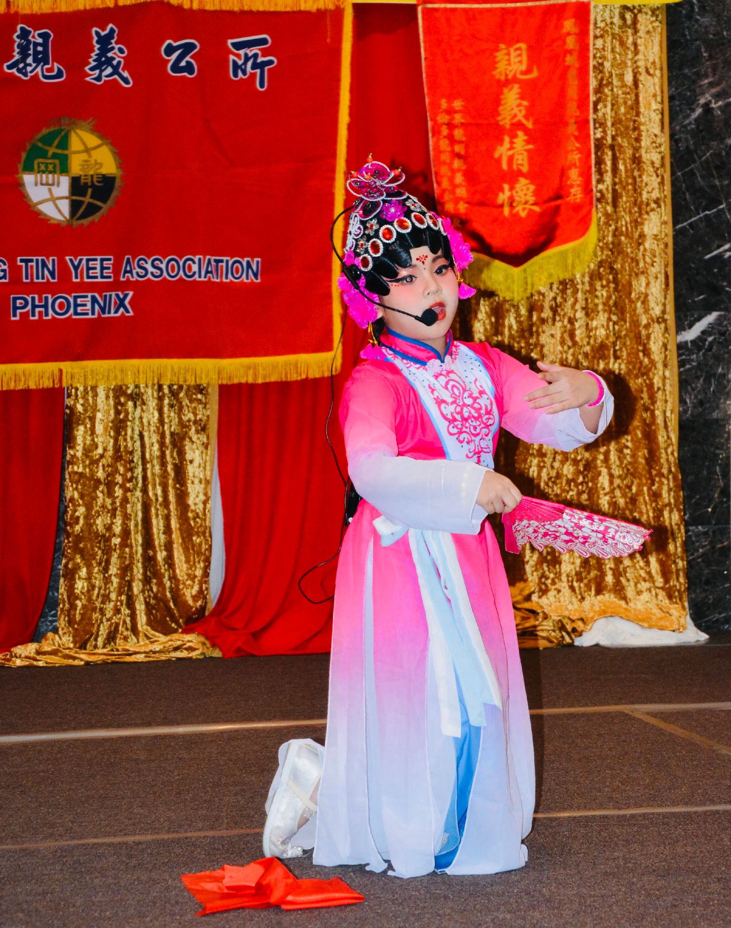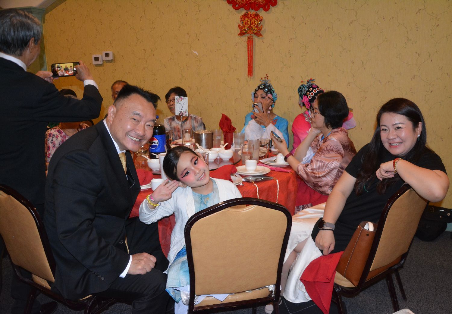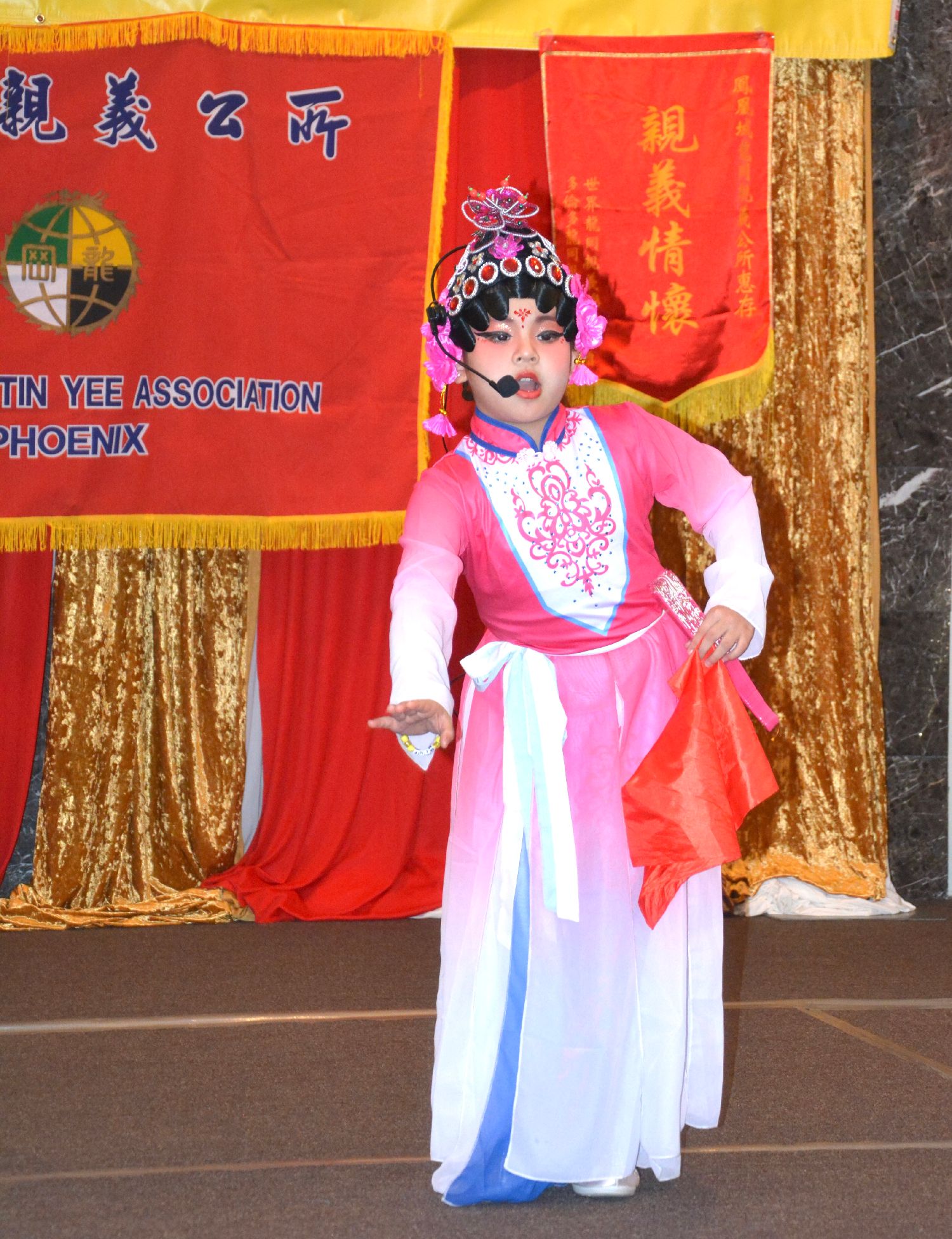 当晚的文娱节目精彩纷呈,副主席关小美与元老张肇鸿以广东方言首先上来一段《马年说马》,以此恭祝大家马年顺遂。今年很难得邀请到凤凰城粤韵曲艺团五位乐师同台演出,他们除了在迎宾时段演奏广东音乐外,还在台上献上《喜洋洋》《娱乐升平》《孔雀开屏》等经典曲目,悠扬悦耳,余音绕梁。在该乐团伴奏下,陈爱卿深情独唱《欢乐年年》,并与陈仲兴师傅对唱《花好月圆》,赢得阵阵掌声。随后,段晓斌与两位搭档一起表演舞蹈《惊鸿舞》,舞姿优雅动人;年仅五岁的凤凰城“小童星”Miya Duan带来京剧唱段《卖水》,童声清澈灵动,博得全场喝彩。