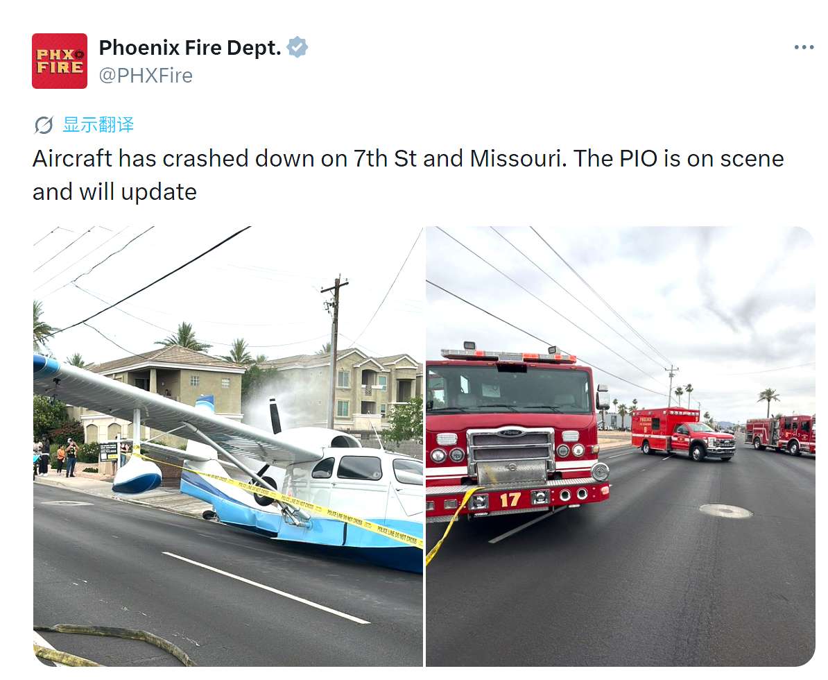 【本报讯】据凤凰城消防局通报,4月12日下午,一架单引擎小型飞机在第七街与Missouri路附近紧急降落,机身停在居民区道路中央。事故导致第七街部分路段(Missouri Avenue至Colter Street)因现场处置及水管受损而临时封闭。警方确认,地面居民无人受伤,机上3人自行走下飞机,伤势不重。事故原因仍在调查中。