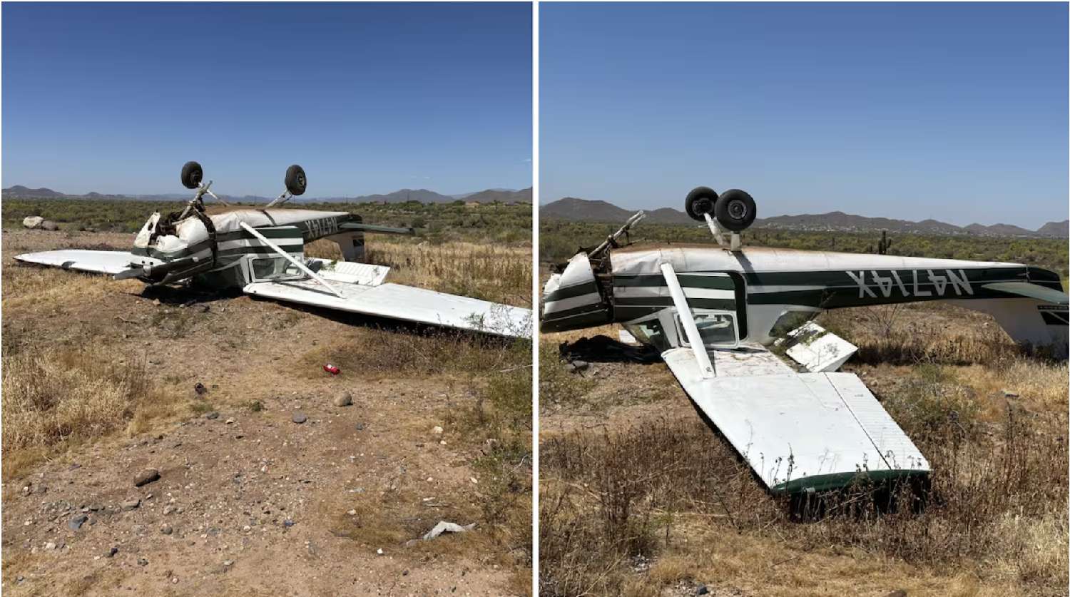 周三上午,凤凰城北部Cave Creek垃圾填埋场附近亦发生一起小型飞机事故。一架Cessna150G在Carefree Highway附近沙漠地带迫降时翻覆,机身倒置。机上两人成功自行脱困,并被送医检查,伤势稳定。消防人员表示,飞机未起火亦无燃油泄漏,属于“最佳结果之一”。目前,Federal Aviation Administration(FAA)与National Transportation Safety Board(NTSB)正对两起事故展开调查。